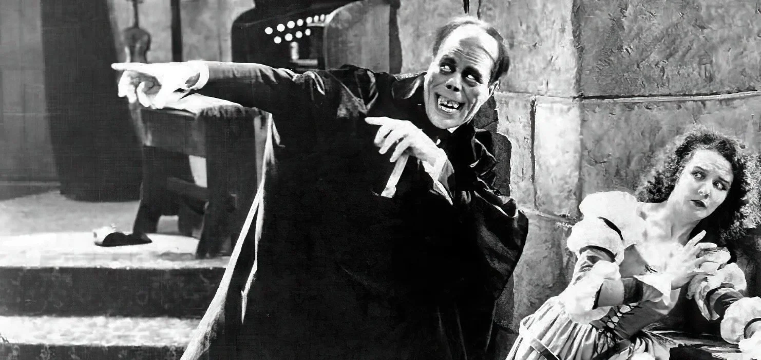 Lon Chaney famously designed the Phantom’s makeup to resemble a skull, partly by attaching thin, translucent fish skin to pull back his skin, yanking up his nose with a wire, and supposedly putting egg membrane on his eyeballs to give them a cloudy look. The moment opera star Christine Daaé (Mary Philbin) pulls the Phantom’s mask off, you’ll see real surprise: Philbin was kept in the dark about just what Chaney had concocted until it was time to shoot the scene.