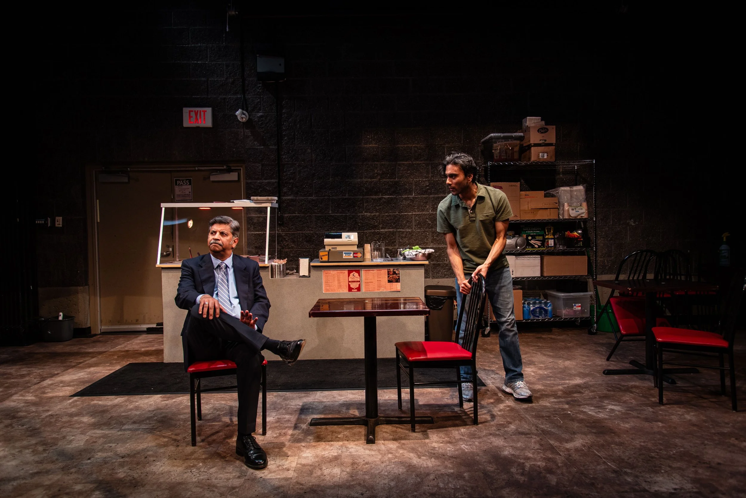 The play opens with Ayub (portrayed by Praneet Akilla), the all-in-one employee who works at Qadir’s modest restaurant in Toronto, called the Mughlai Moon. One evening, his nightly after-hours routine is interrupted by Jalal (Zahf Paroo), a disoriented cab driver in desperate need of Indian food. Unspoken tension immediately fills the air, leaving us to wonder what is at stake, and what is standing between these characters.