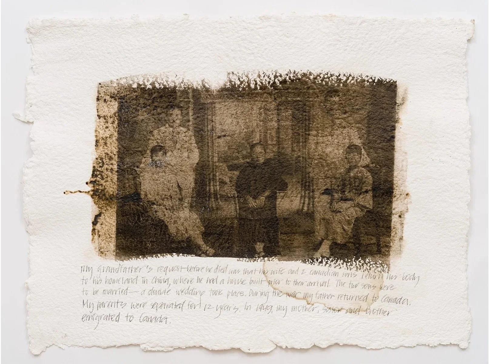 Sharyn Yuen’s Wedding 1932, from the Jook Kaak series, 1986, photo emulsion, graphite, handmade paper. City of Burnaby Permanent Art Collection.