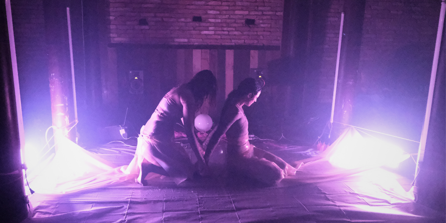 The duo developed hyaline early last year at the A. Farm artist residency based in Ho Chi Minh City, Vietnam, where they presented it as a work-in-progress performance. They drew on slug mating rituals, butterfly mottling processes, and mycelial networks to explore the line between humans and nonhumans. In their expansion into movement work, Weiner and Xio work with performance and movement artist Jas Lin as their movement coach, particularly leading up to their performance at VIVO Media Arts Centre.