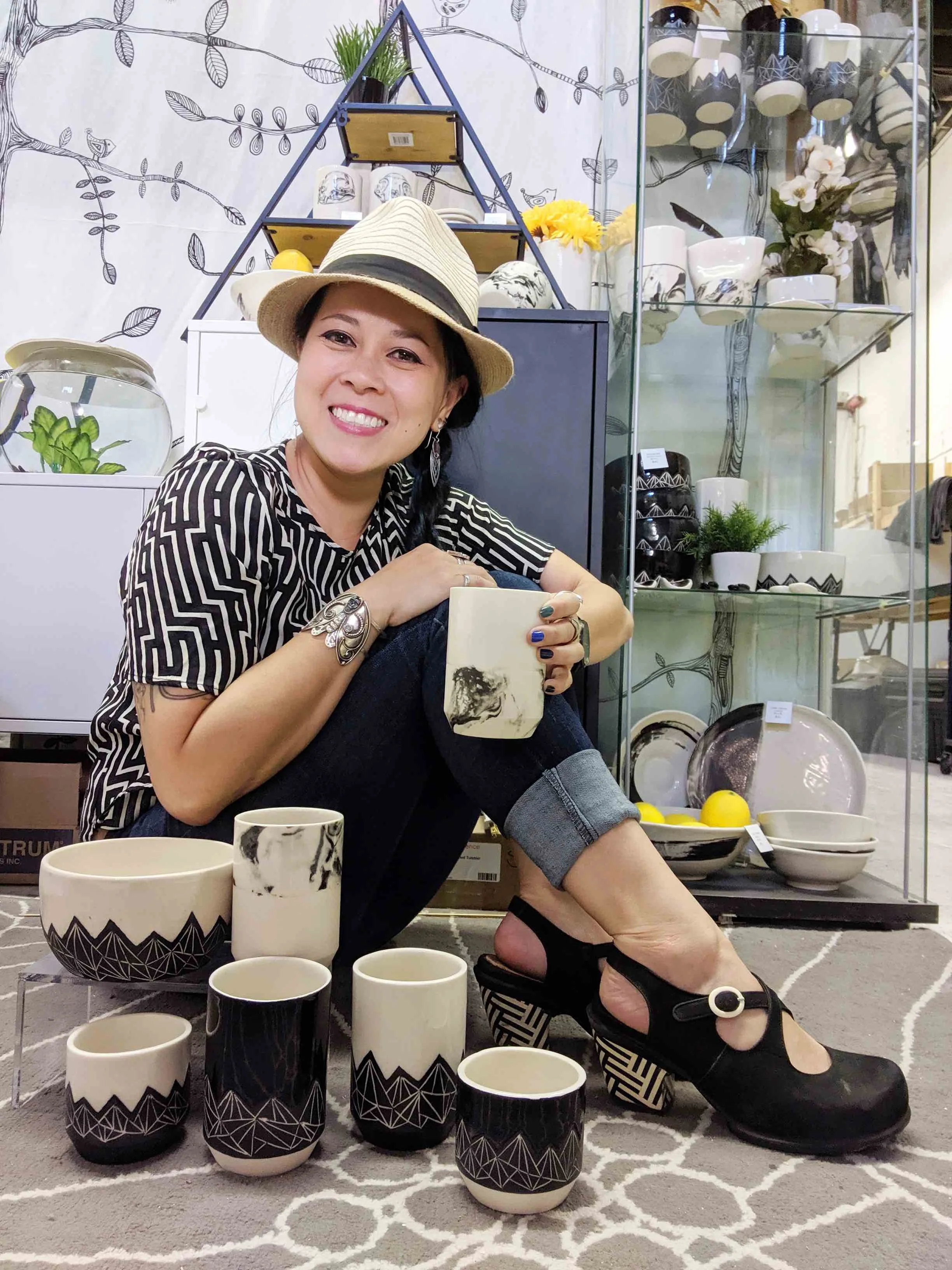 Chu is originally from Toronto and works primarily with ceramics, often experimenting by using techniques from other mediums—such as silk-screening and airbrushing—on clay. She’s perhaps best known for her “Geometric Mountain” series, which features white peaks on black-glazed ceramics. Chu also creates large murals like the one in her studio.