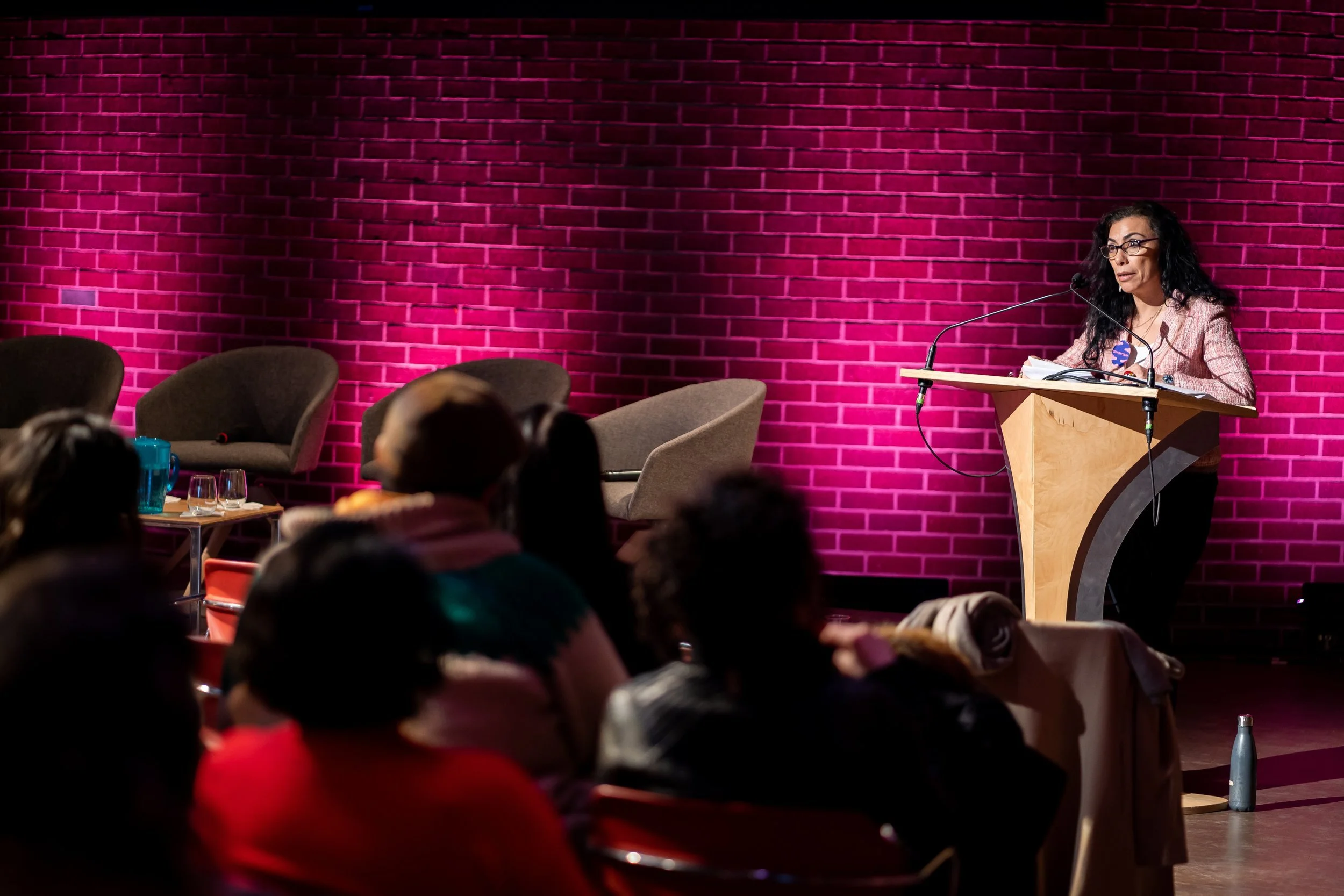 Carmen Aguirre speaks at the inaugural 2020 Coyuntura. Photo by Brandon Law
