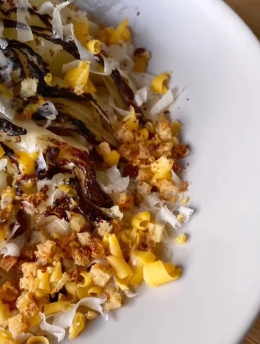 Lee makes everything in house, including the insanely addictive flattened garlic bread, no easy feat in his micro “office”. “I make the dough two to three days in advance in a very terrible stand mixer one kilogram at a time, times six, with simple ingredients and pay attention to the sourness of the ferment each day. It also gets stretched and more importantly cooked to order regardless of how busy I am.” Once it’s fully puffed, the bread is submerged in fried garlic oil, then served with “everything bagel creme fraiche (replete with seeds and a few Cheerios to represent bagels. As with the cruciferous vegetable in in the BBQ Cabbage Caesar, all of the veggies on the menu are cut, grilled, and steamed with strawberry vinegar and butter on a plancha, Lee explains, “to ensure their integrity”.
