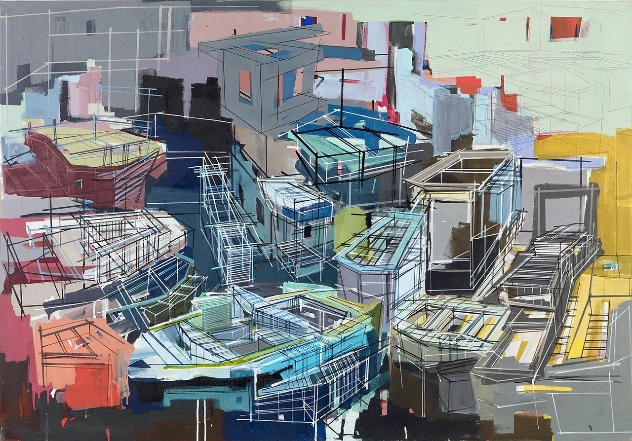 The unique contemporary art Thomasos produced throughout her career introduced and challenged the idea at the time that art should not be political. Working in her own personal experiences and political stances as a Trindadian-Canadian, her art takes vibrant semi-abstract form in her large-scale paintings. She took a major interest in portraying mass incarceration and confinement, incorporating pops of colour and architectural motifs from prisons, cages, boats, and low-income tenements. In 2007’s Excavations: Courtyards in Surveillance, Thomasos highlights the theme of lack of space and confinement by playing with fine lines to create crate-like images stacked upon one another in abstract repetition.