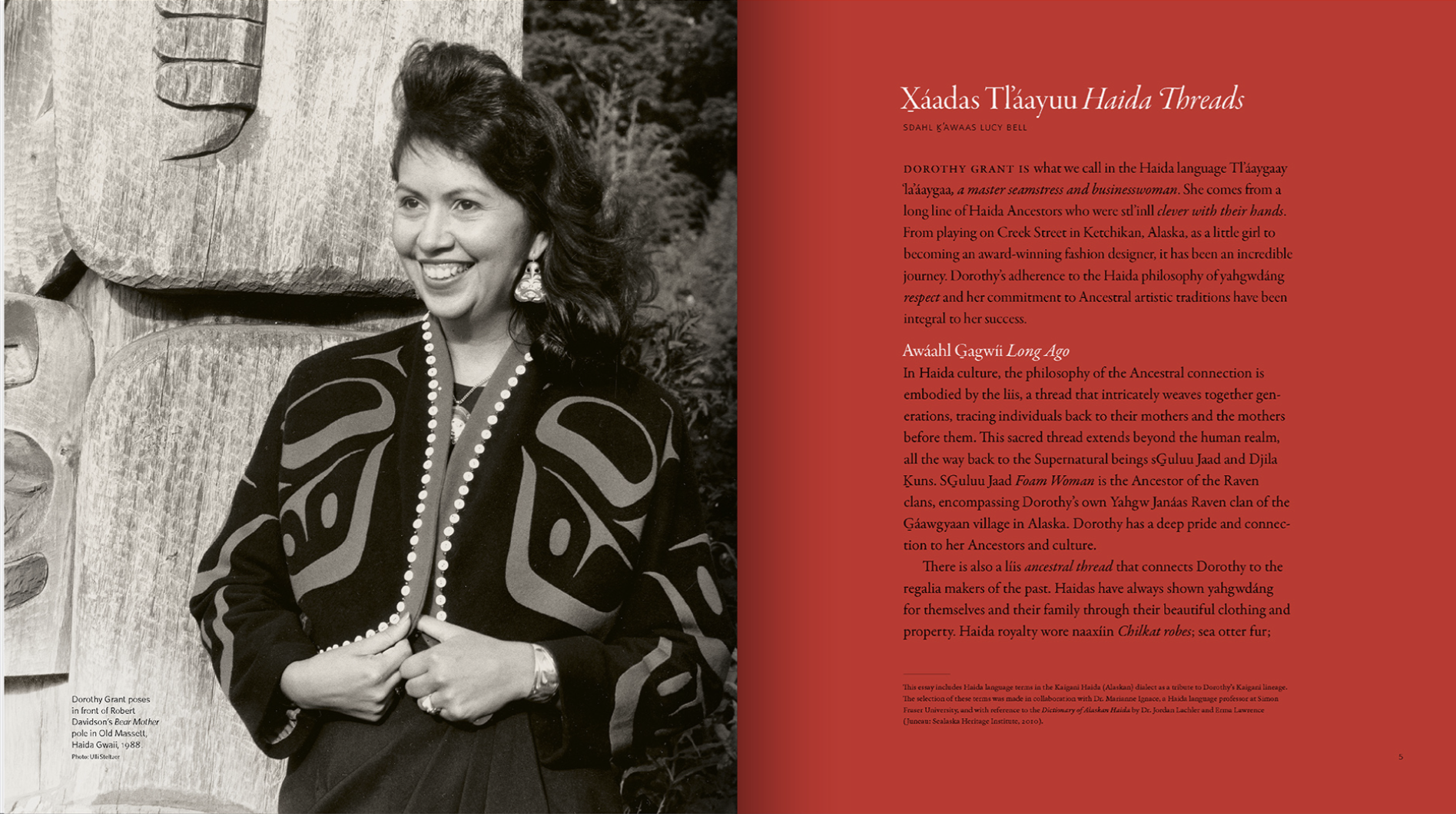 Grant, of course, would have a long tradition to draw on for her contemporary designs: as she’s quoted in the book as saying, “Our people have been in fashion design for millennia.” Intricate Haida garments long communicated knowledge and beliefs, including lineage, history, and the reverence for the natural and spiritual—traditions that carried forward despite centuries of colonization and potlatch bans.