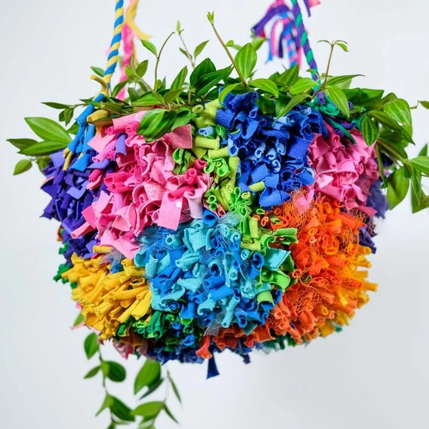 Fun explosions of colour, employing artfully reused and recycled textile waste and offcuts. Think knobby, multihued rag-rug hanging baskets and lampshades. Shag-adelic!