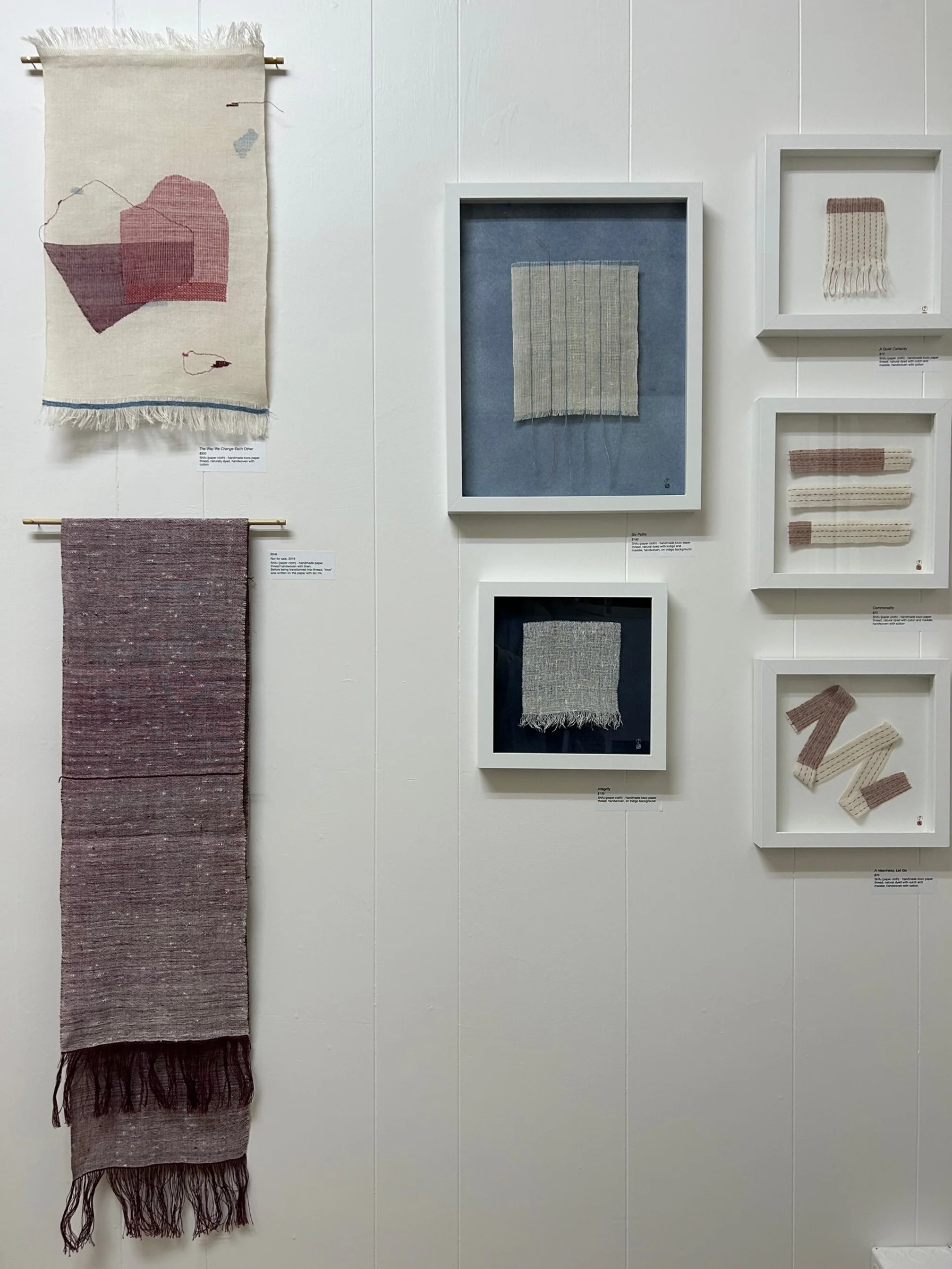 5:20 pm: I make my way up to the second floor. Right away I gravitate to suite 204, the studio of Sabrina Sachiko Niebler, whose delicate designs draw on the Japanese craft of kami-ito (paper thread) while using fine shifu (paper cloth). “My work consists of having a peaceful space and being within the body. It has connected me to my heritage,” the artist says.