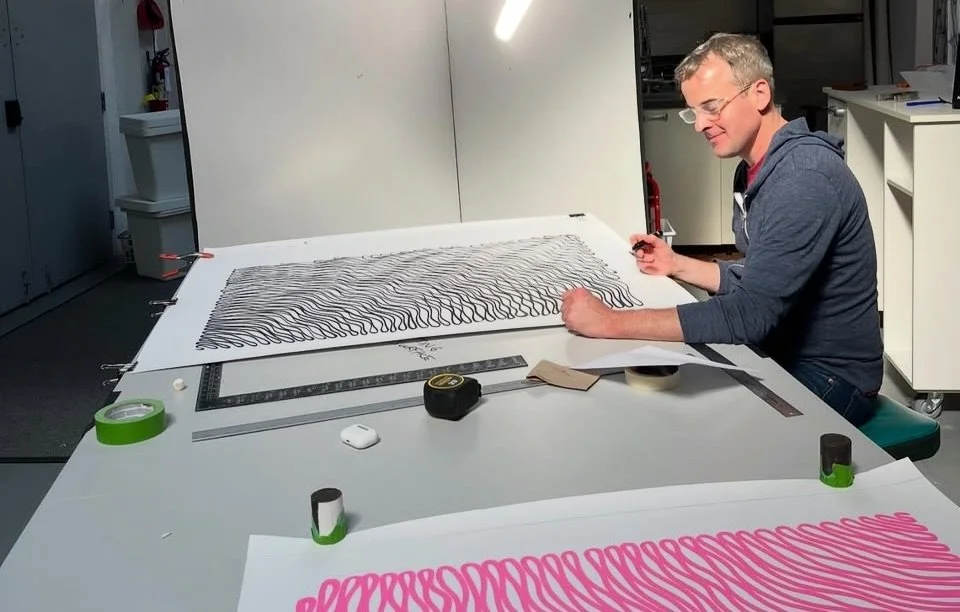 Mahler creates his pieces by applying acrylic paint markers to paper. Working within his self-imposed parameters—each drawing must be a single, continuous freehand line; segments of line can meet and converge, but must never cross over one another—requires him to strike a balance between intense focus and Zenlike calm.