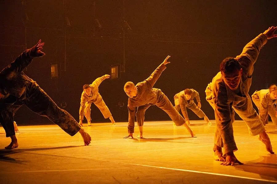 Take Ever So Slightly’s opening sequence, where 10 dancers in coveralls come to life on the floor like gently rolling waves, their slo-mo downrocking becoming hypnotic poetry. Heightening the scene, as they do the entire performance, are live multi-instrumentalists Jasper Gahunia (DJ for hip-hop artist K-OS) and William Lamoureux, creating an aural dreamscape with haunting violin and guitar from risers at the right of the stage.
