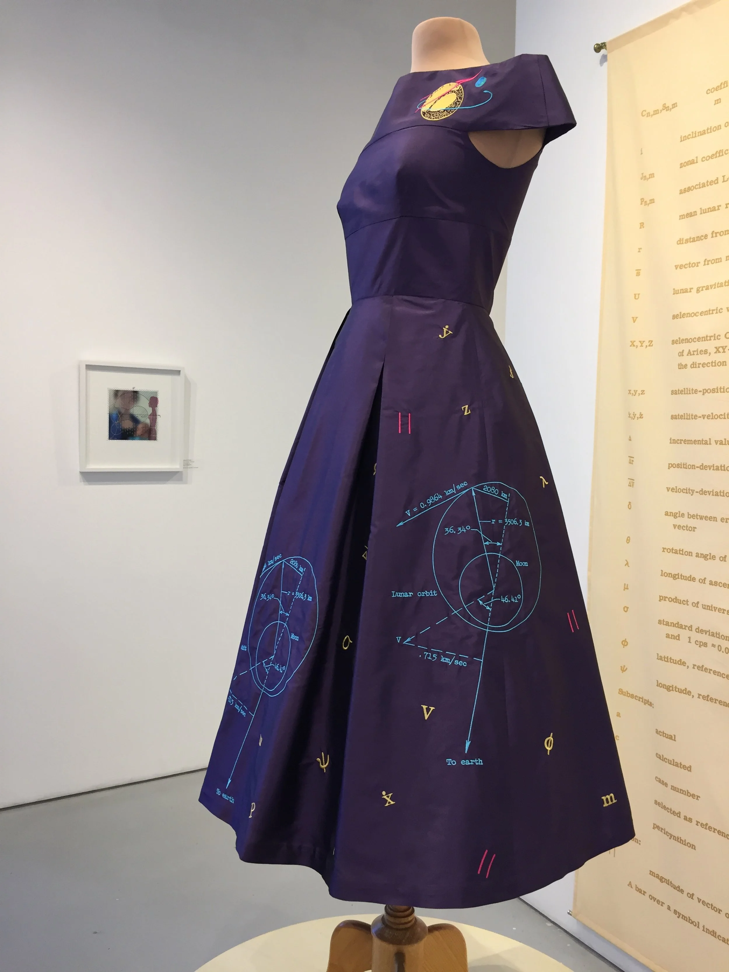 “[The gown] is one that I thought she might have made herself had she been invited to an imagined NASA event celebrating that first moonwalk in 1969,” Stewart says. “I would like the viewer to consider the connections between the beauty of mathematics, the beauty of a lovely dress, and the beauty of a life fully lived.”