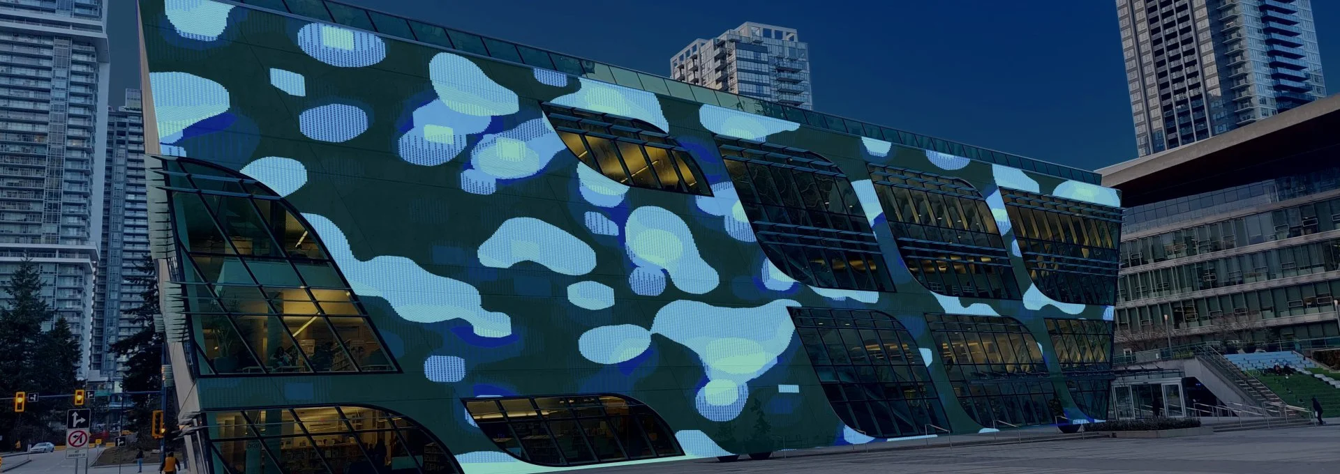 Projected on a large screen on the Surrey City Centre Library facing Surrey Civic Plaza, the colourful pixel animations with sound capture the movement of water, light, wind, and air from seven key geographic sites around the city: Serpentine River, Redwood Park, Crescent Beach, Nicomekl River, Boundary Bay, Serpentine Fen, and the Fraser River.