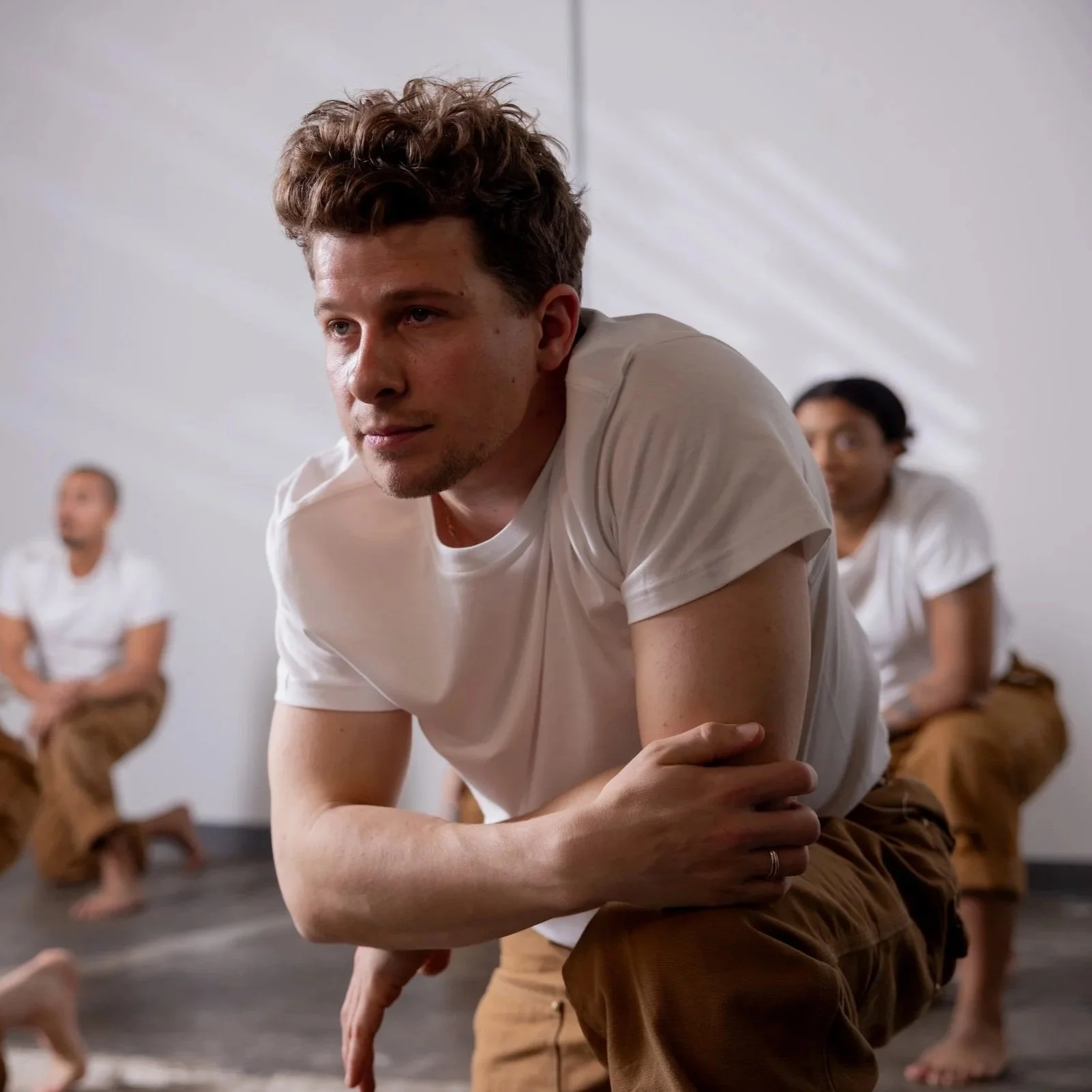 The Roundhouse’s industrial nature will shine through in the show; there won’t be any theatre drapery. Jono Kim’s lighting design will showcase the venue’s brick backdrop. And the dancers will be outfitted in plain white tees and brown pants—clothes that Enquist describes as uniform-adjacent, rather than the artistic costumes so often seen in dance productions. A pulsating score he put together with Tyler Layton-Olson alternates between periods of frenzy and silence.