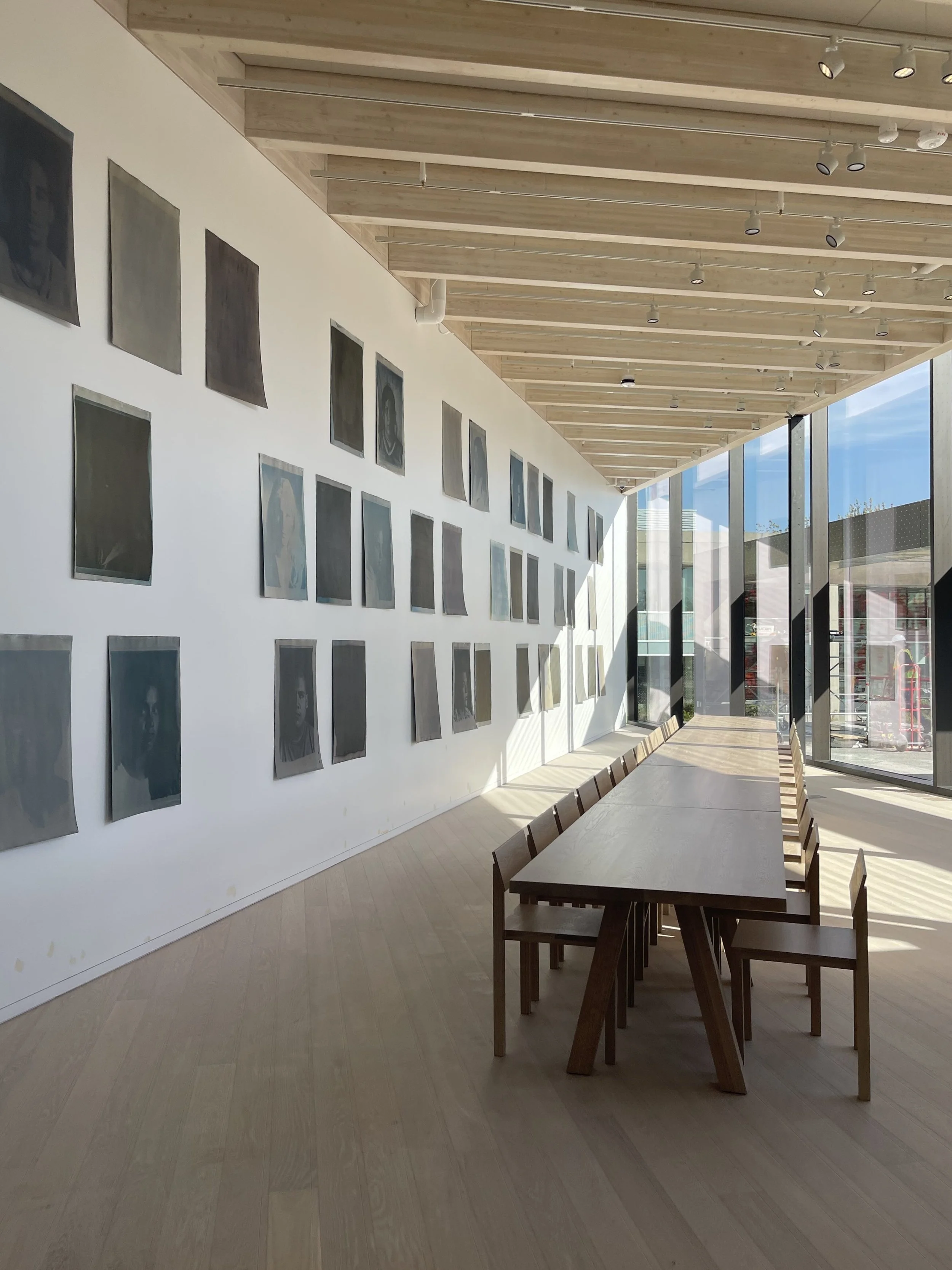 The Gibson is made up of several gallery spaces that are sectioned off with window-lined halls; outside, there are courtyard areas with chairs, tables, and freshly planted saplings. Kimberly Phillips, the museum’s director, shared during a tour before its opening that a big intention behind the design was to bridge the gallery with the surrounding forest in the hopes of making visitors feel at ease.