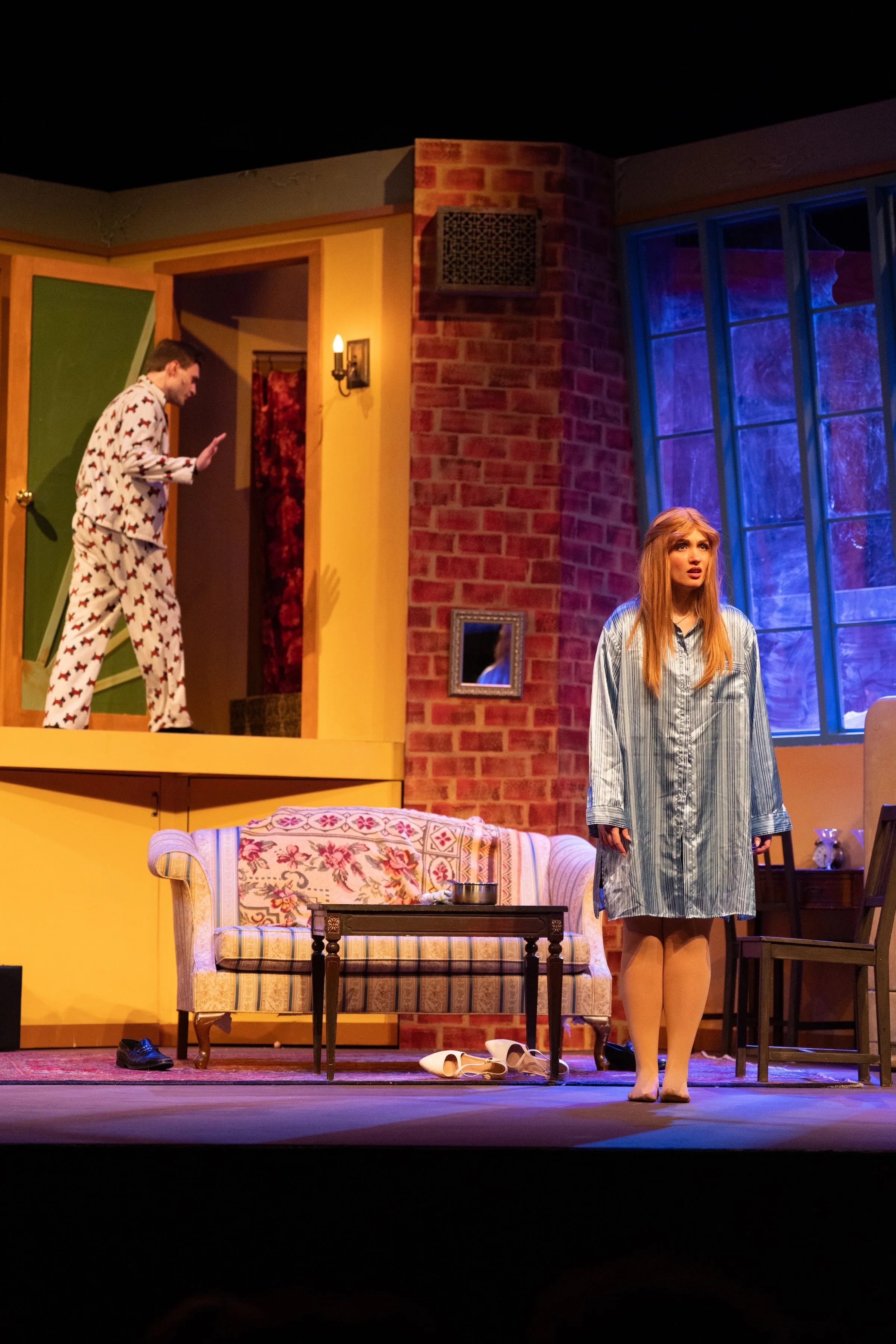 Glenn MacDonald’s set is well suited to the play’s moments of physical comedy, and captures the particular awkwardness of a first apartment that already feels like a compromise. And though the skylight—which, of course, also becomes a problem—isn’t quite a skylight here, reading more like a very high window, the sight gags involving this feature of the apartment work just as well.