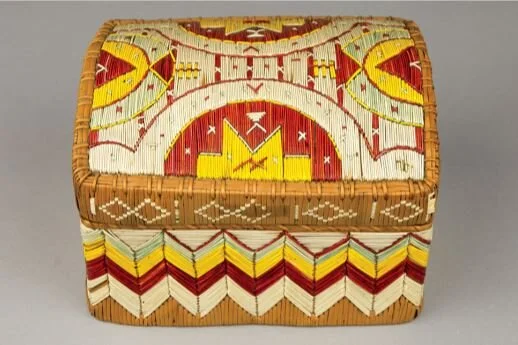 This porcupine quillbox inspired Jordan Bennett’s al’taqiaq: it spirals. Quillbox and cover, Mi’kmaq Museum of Vancouver Collection, AG 103a-b, via 3,599 Miles: An Interview With Jordan Bennett.