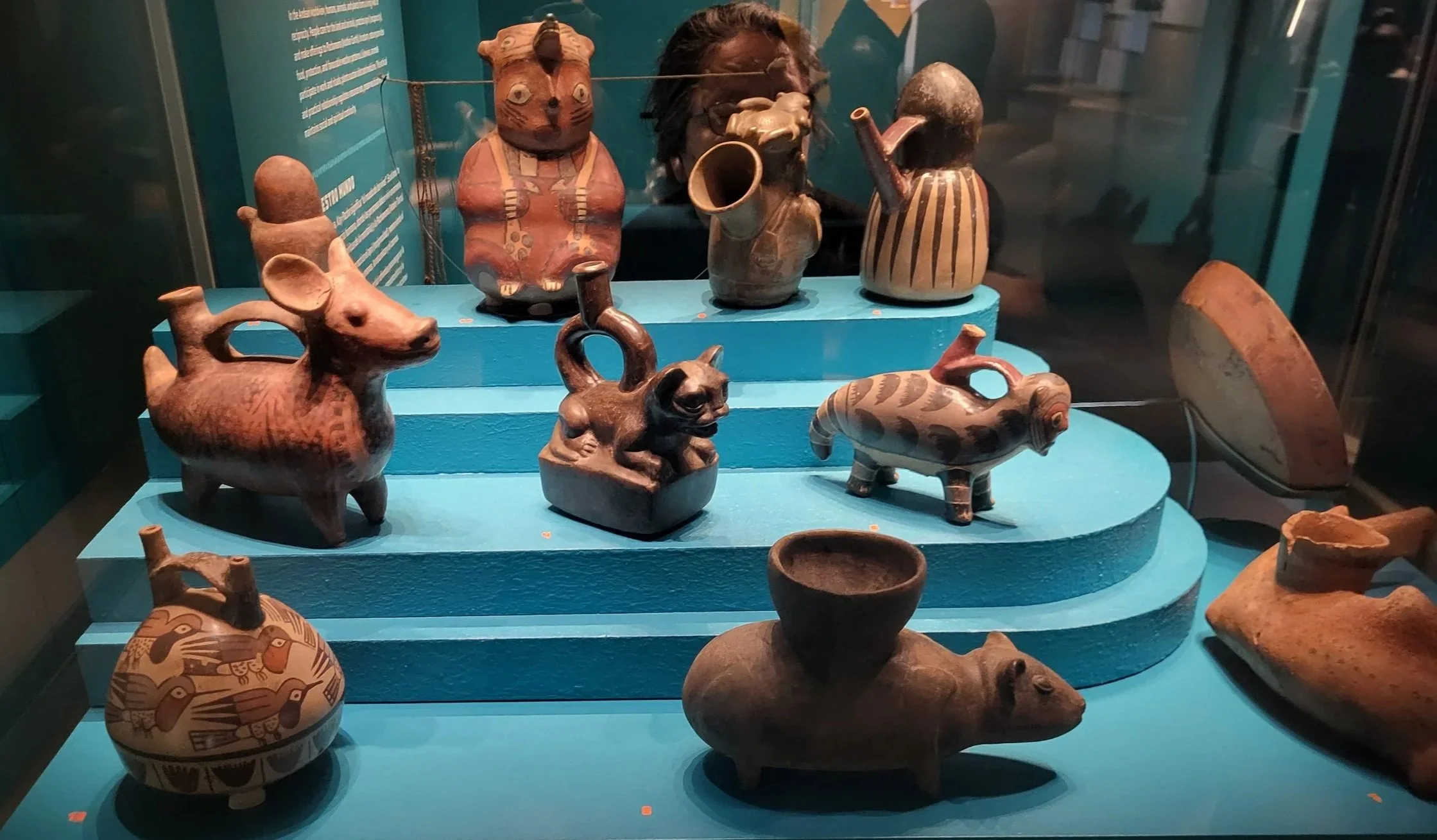 The Kay Pacha display, the largest of the three, holds pots depicting animals and humans wearing animal skins—a common theme in ancient Andean art. It also contains a quipu, an Andean record-keeping device constructed by knotting pieces of plant fibre or animal hair in sequential patterns to form numbers.