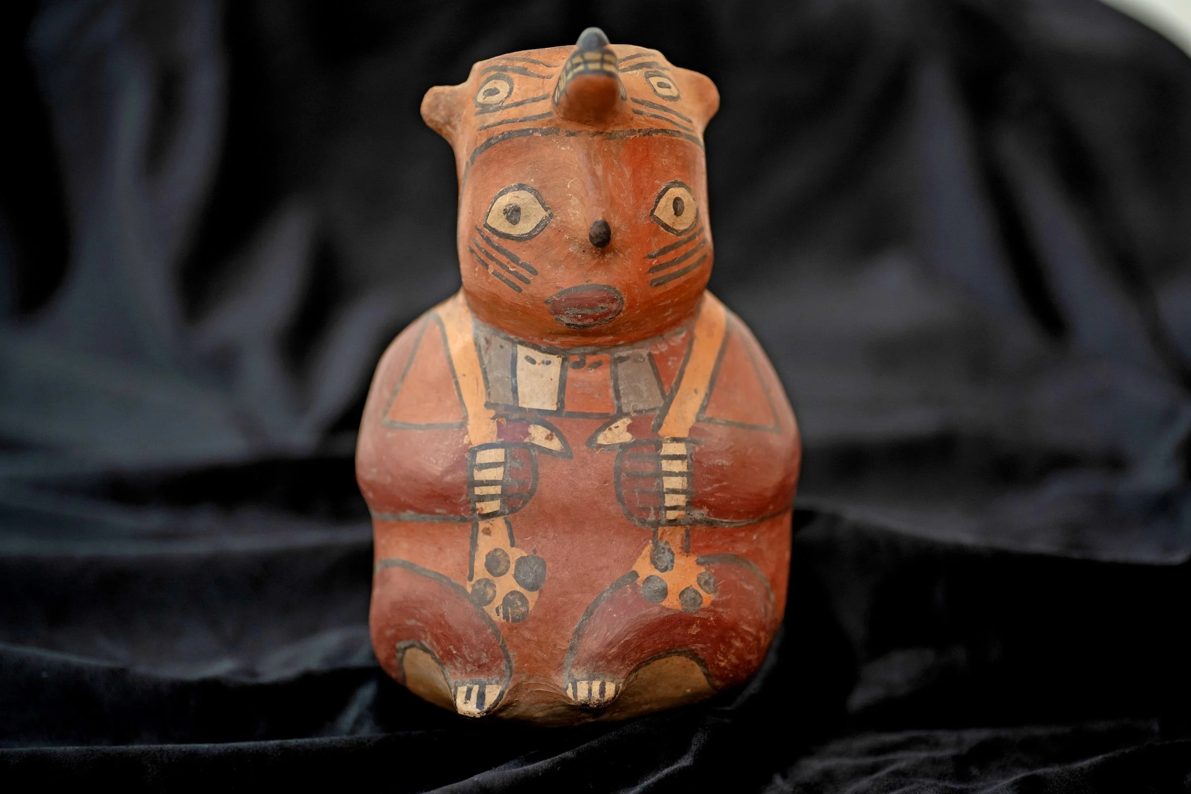The Hanan Pacha display contains one of the largest pieces in the exhibition, a ceramic bowl decorated with human and cat heads wearing large headdresses. These are likely the Apus, the mountain spirits that dwell in the upper world. The case dedicated to the Ukhu Pacha, the world of fertility, displays pottery in the shape of seeds and roots alongside a large bottle painted with the image of a woman holding pepper sprouts. González said this is likely a representation of the Pachamama, the Mother Earth of the Andes.