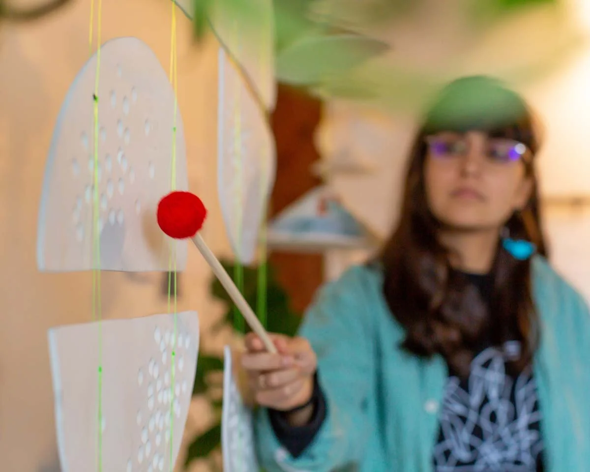 Artist-musician Roxanne Nesbitt plays her dangling sound panels in a Vancouver New Music show that is part installation, part performance