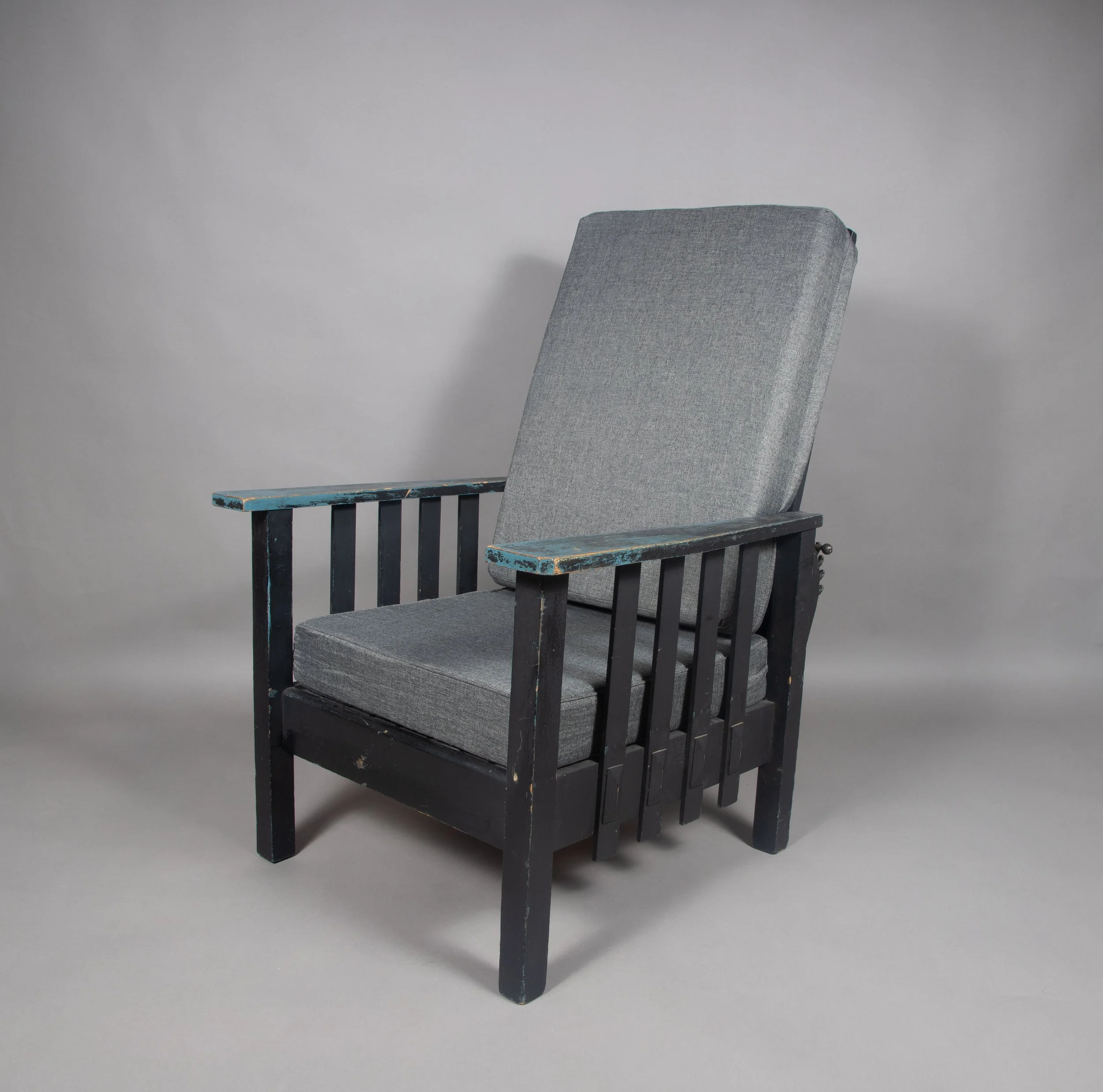 Among the other seats on display in the exhibition is a Morris chair used by legendary Vancouver lifeguard and swimming instructor Joe Fortes. The mechanically adjustable recliner, painted black and faded with use, once sat in his English Bay cottage. Though its original cushion was lost at some point in time, it’s displayed at the MOV with a brand-new grey one so that visitors can picture how it would have looked in its prime.