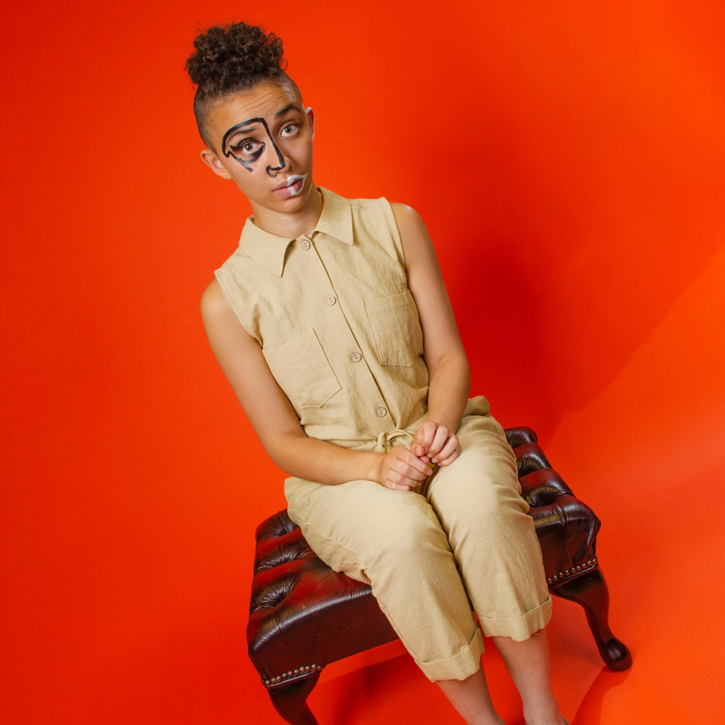 All these thoughts sparked Robinson to start writing Mx, a show that tackles themes of identity, race, and representation. The work, set up in the context of a talk show, finds flamboyant host Mz. Nancy (a play on Anansi, the trickster of West African and Caribbean legend) calling up mixed-race Max (Robinson), encouraging her young guest to connect with Black heritage and diaspora. Mz. Nancy’s foil is the white Samantha, who wants Max to accept the white status quo.