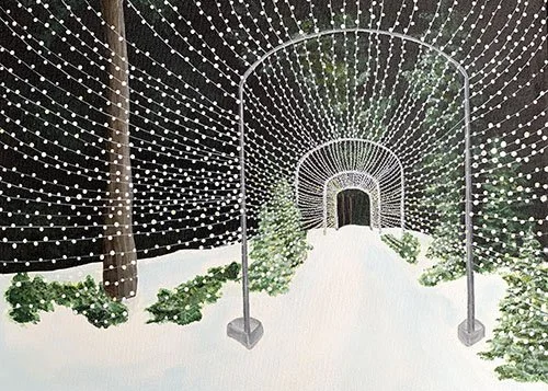 Artist Tara Devine was inspired by the annual tradition of light displays on Grouse Mountain in creating Light Walk, included as the December image in the 2022 You Are Here Calendar.