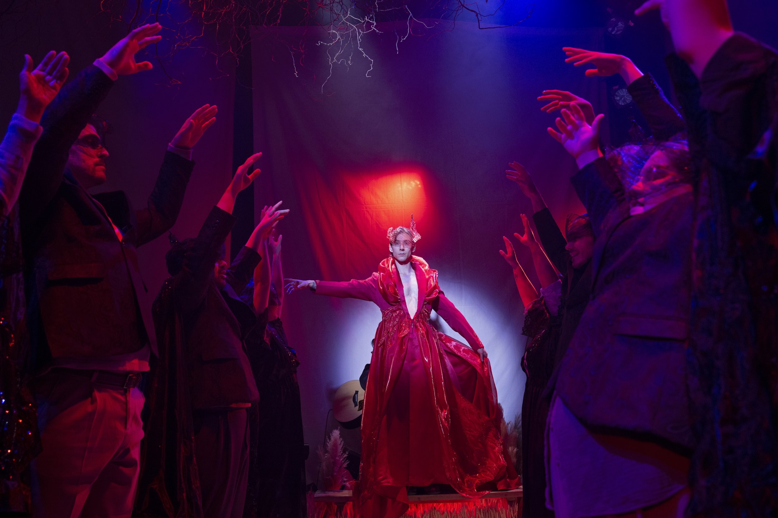 Still, the onstage talent is often powerful. Trapp and Bellward are standouts, creating emotional resonance and connection for their characters. Woike and Jenna Brown—who plays Gracie, one of the Chief’s daughters—deliver gorgeous singing. And choreographer Jera Wolfe and assistant choreographer Nathan Coburn perform a powerful contemporary ballet duet with striking beauty and athleticism. In fact, the duet is one of the show’s strongest storytelling elements, because the movement, along with the addition of menacing, cloaked figures, invites audience interpretation.