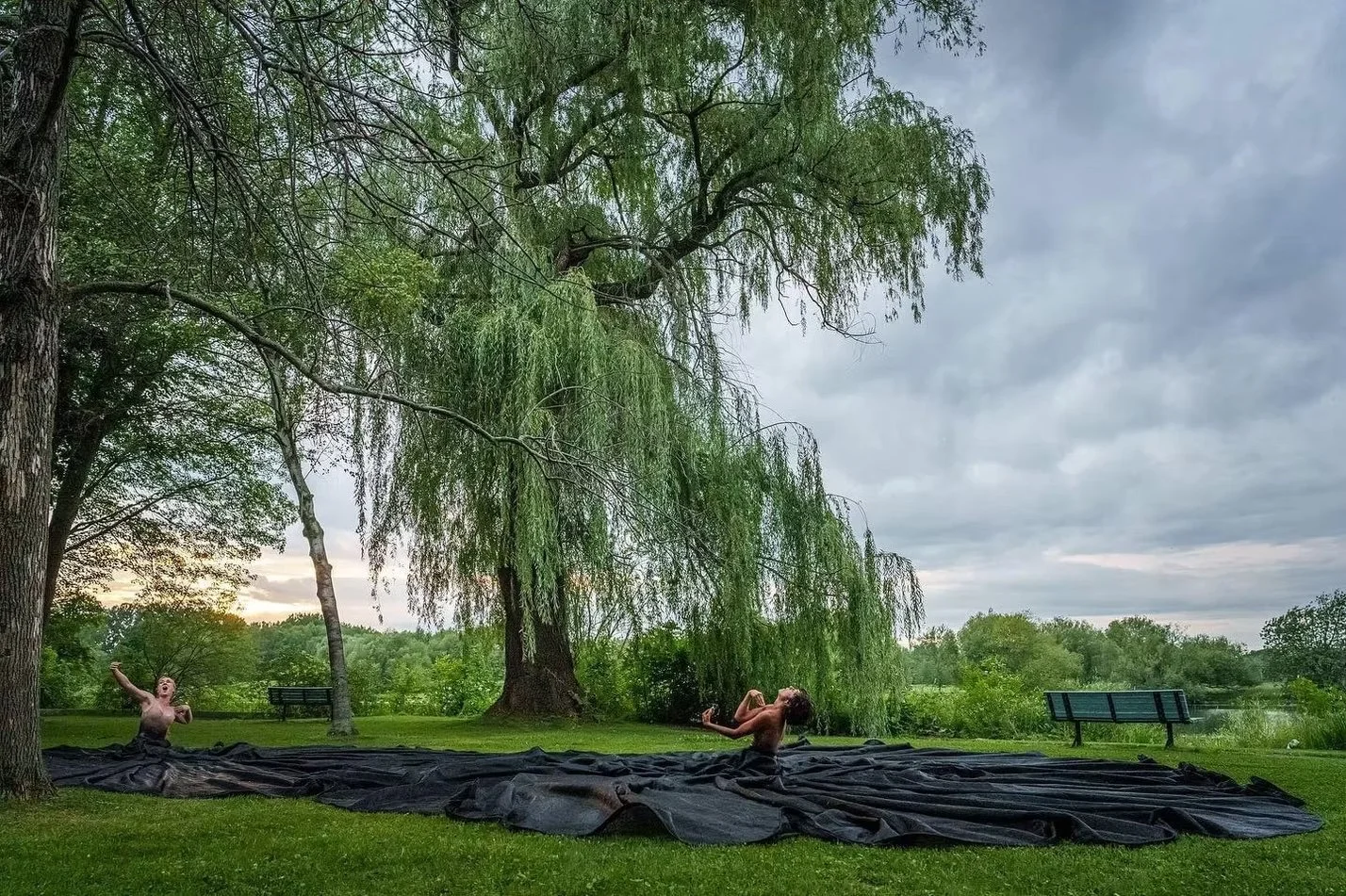 In Caron’s 2024 short film “Marée Noire”, two dancers meet atop the frozen Saint Lawrence River, dressed in swaths of heavy black fabric that spread out around them like oil spills in reference to the disaster. When Stir connects with the French-speaking Caron by Zoom, she’s joined by “Marée Noire” dancer Geneviève Robitaille, who vividly recalls what it was like filming the project in the dead of Quebec winter at -30ºC, as a snowstorm whipped around them.