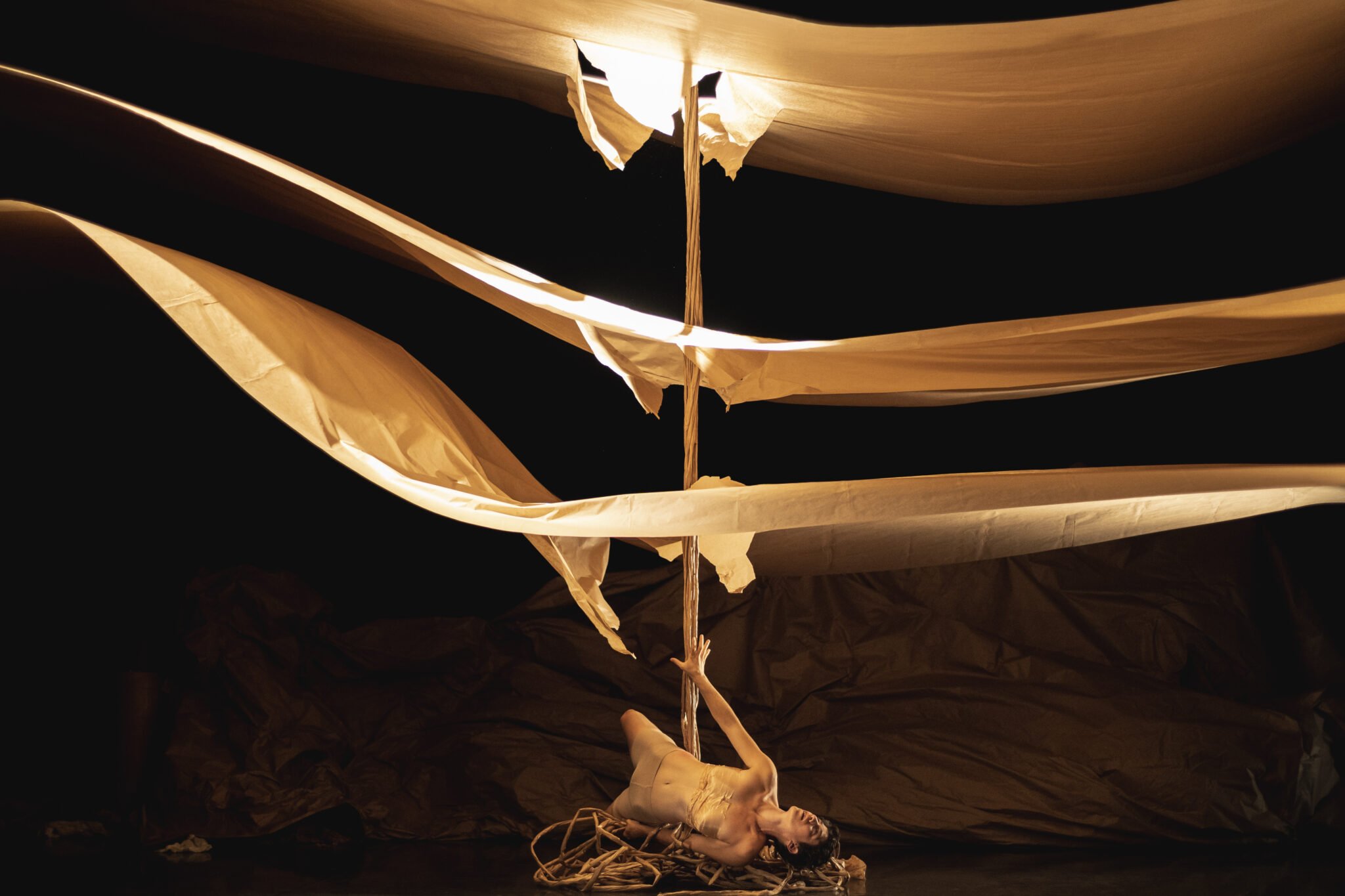 In Pli, paper morphs into a playground, a dance partner, an aerial rope, a costume, and an ever-shifting sculpture. The set is made entirely of the stuff, with performer Inbal Ben Haim dancing with, on, and around it. Twisted, crumpled, and torn into various forms, paper supports the artist one minute and is ripped to shreds the next. It is constantly transforming.