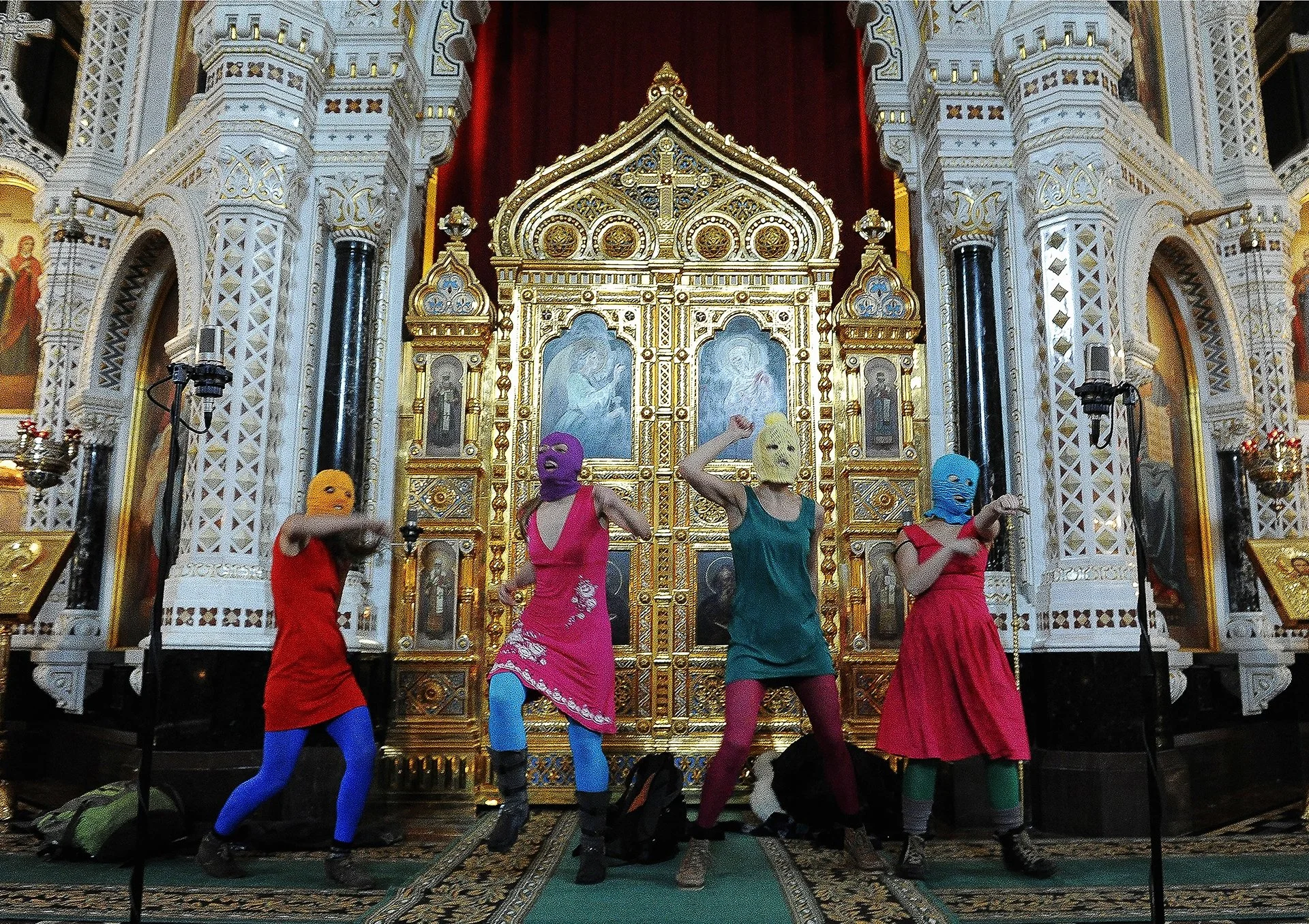 Equal parts performance-art troupe, punk-rock band, and activist collective, Pussy Riot formed in 2011 and quickly gained notoriety through a series of high-profile guerilla performances. Two of the most famous of these occurred in 2012: “Putin Peed His Pants” in Red Square, and “Punk Prayer”, staged at Moscow's Cathedral of Christ the Savior. Through the latter action, the group aimed to protest the Russian Orthodox Church’s support for Putin during his election campaign.