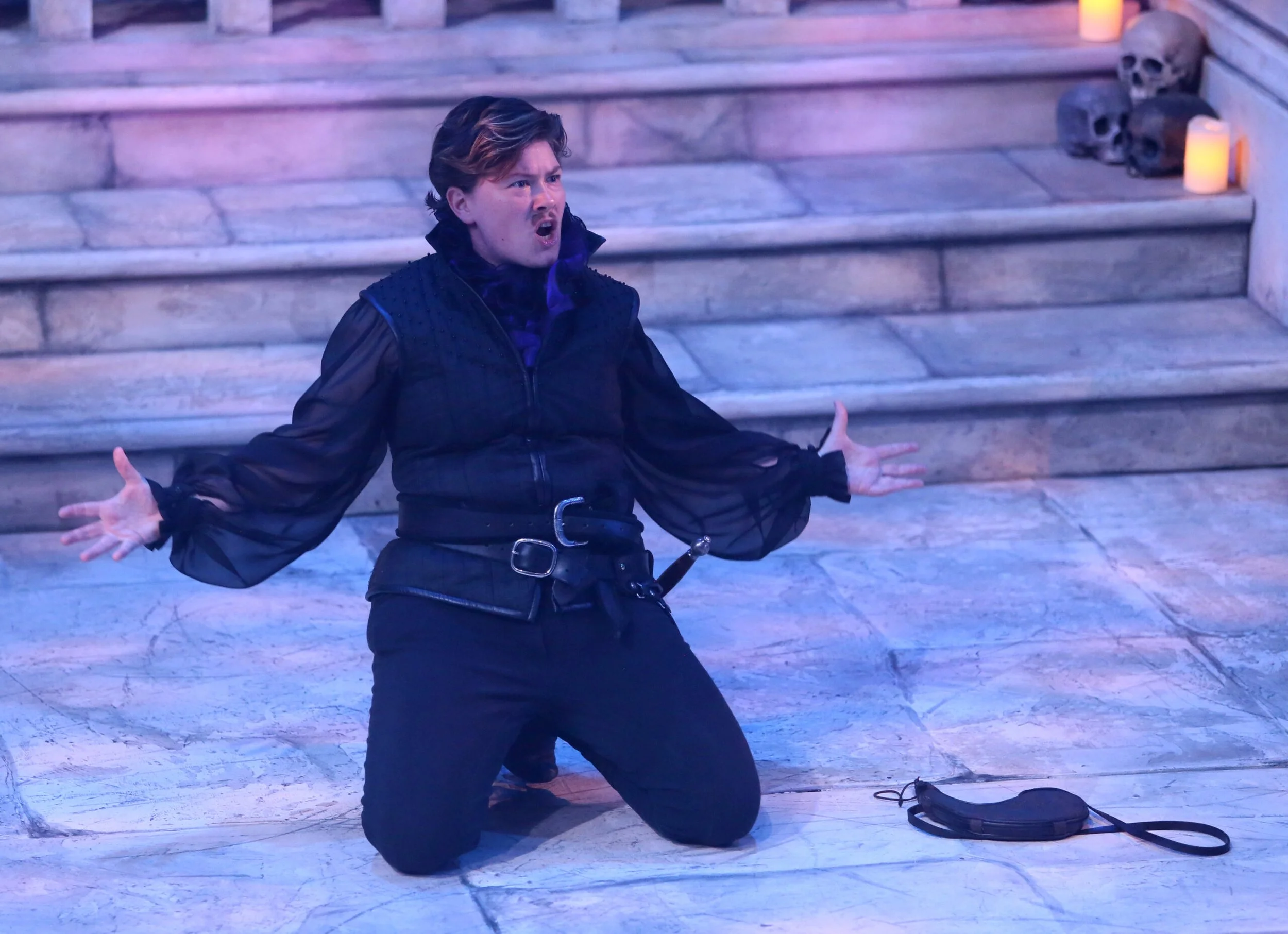 But let’s back up for a minute. Arguably Rochon’s boldest change is the play’s opening—and it’s instantly effective. The cast members gather in a skull-lined crypt, take their places, and then Juliet awakens, with one huge gasp, from her potion’s deep sleep to find Romeo dead beside her. (It’s a scene we will circle back to at the end.) Throughout, Juliet watches from the background, in an almost dreamlike state, as the events that led to the disaster unfold chronologically from the beginning. The framing emphasizes her perspective and her agency in what goes down. And yet it sets a dark tone, located as the entire plot is in a tomb with death all around from the get-go, conflicting with the lighter overall take.