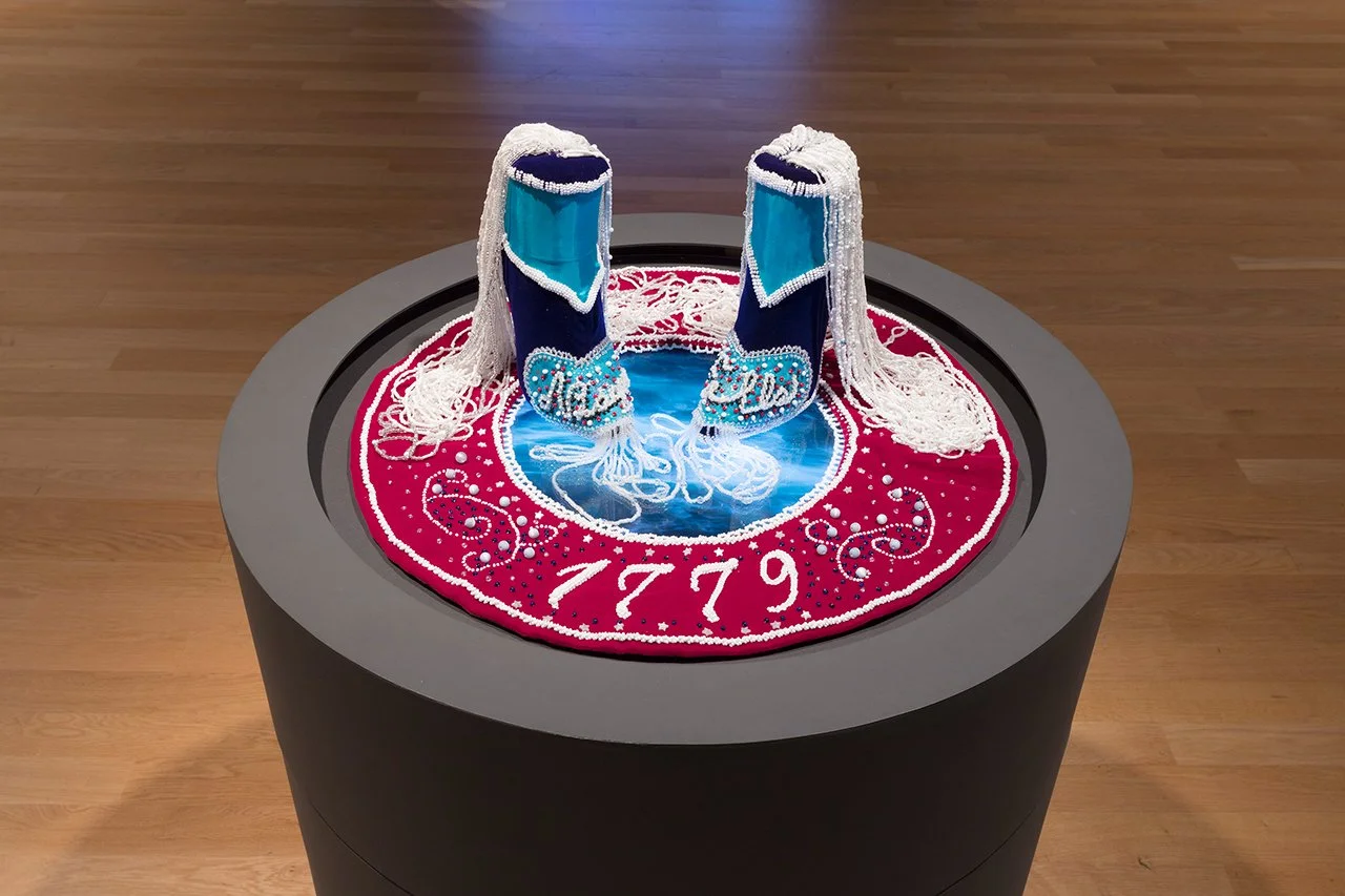 In the multimedia sculpture 1779, white beads cascade down from the tops of two glitzy blue high-heeled boots, gathering in swirls over video of the Niagara Falls rapids—a statement on the forgotten Indigenous displacement on the site, and the kitschy showgirl it’s become.