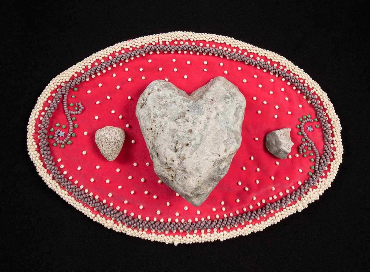 Shelley Niro’s My Stone Cold Heart Needs a Bed Too, 2018, stones, beadwork on velvet, courtesy of the artist. Photo by Robert McNair