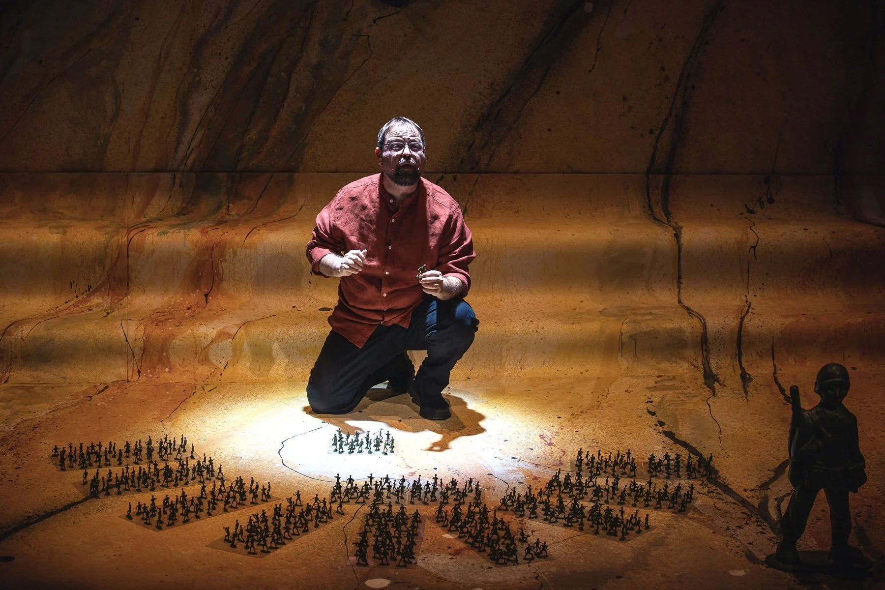 Set designer Brian Ball has created a fascinating, desert-gold-hued abstract-painting rendition of the contested Middle East zone where Israel sits, stretched across the back of the stage to skew perspective. It covers part of the floor, where Erdal manoeuvres hundreds of tiny toy soldiers, which can represent everything from the collected masses of the IDF to the victims of the Holocaust. Effectively, three larger versions of those khaki-green toy soldiers stand in for three clearly delineated characters who capture the different points of view of Israelis forced to serve on the frontlines. Veteran lighting designer Alan Brodie brings still more dimensions to Erdal’s storytelling.