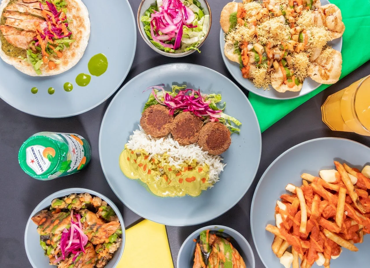 Coconut Korma rice bowl with Chana Kebab (centre) and more, at Indish.