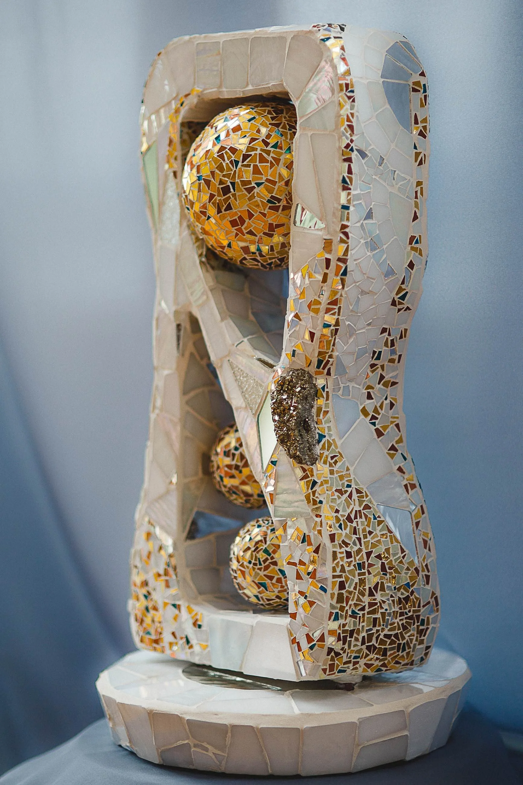 Daryl Lynne Wood’s Waiting to Be Born, gold and silver smalti, stained glass, mirror, pyrite.