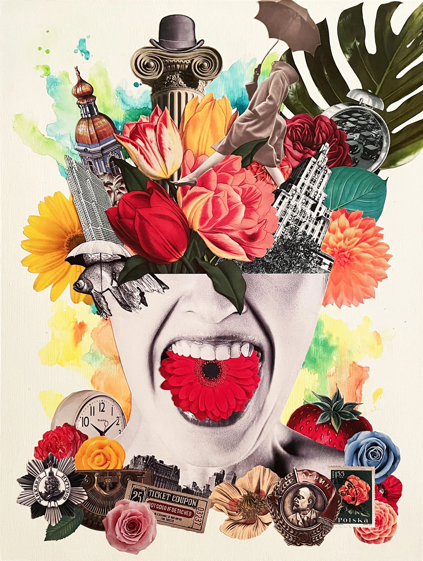 Ginger Sedlarova, Darling Can’t You Hear Me? Collage and watercolour on wood panel,16”x12”. Photo via the Gallery at the Cultch