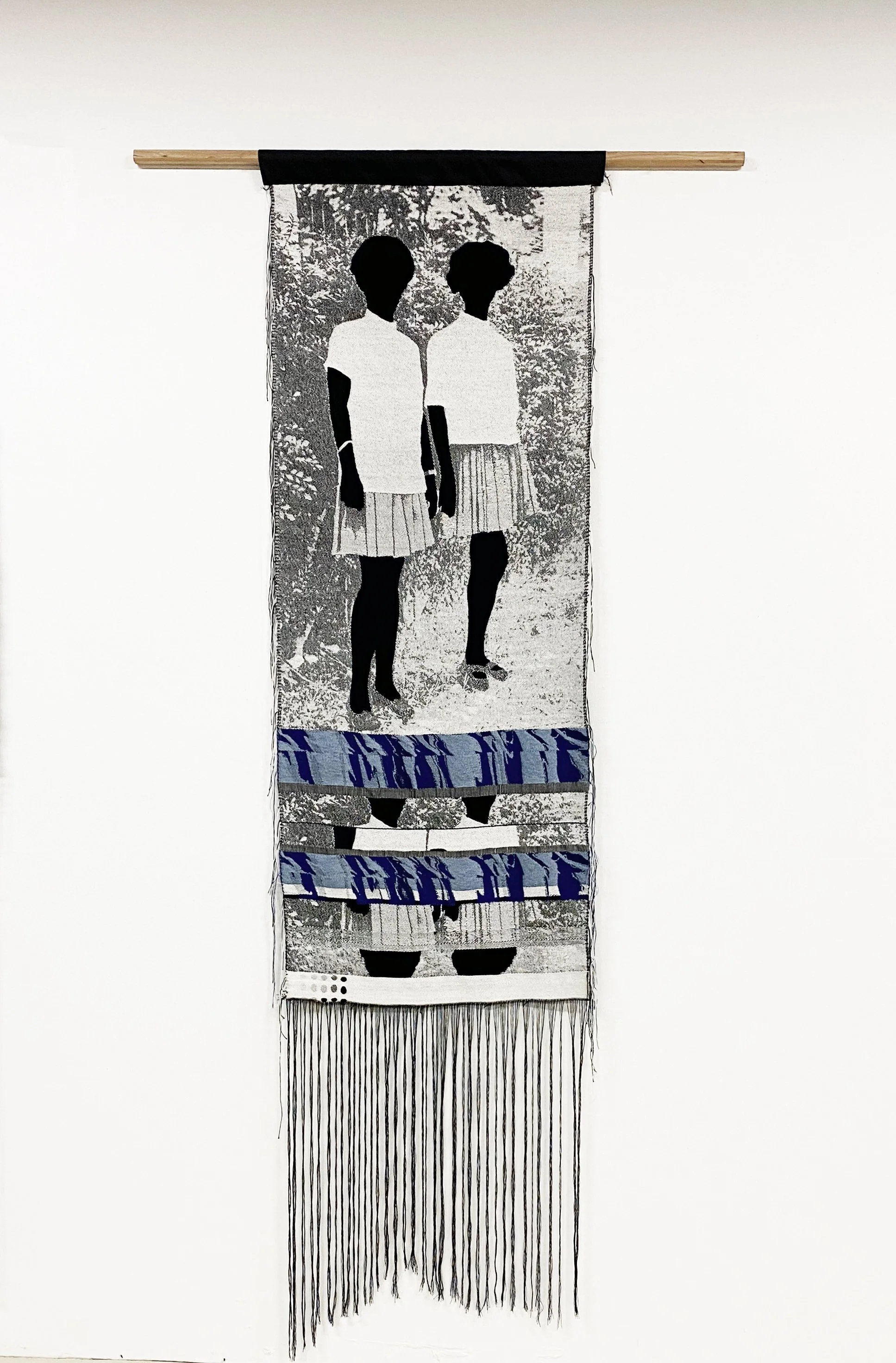 The care that Sergile has taken in making the images is evident; it can take weeks to thread the large looms Sergile uses in the process. But the weaving also carries rich metaphorical meaning, in “the bringing together of cultures and the multiple threads that come together to make a culture or to make an identity,” as Wall says. Each hanging panel frays and fringes at the bottom—identities yet to be woven, stories fraying through time or perhaps waiting to be told.