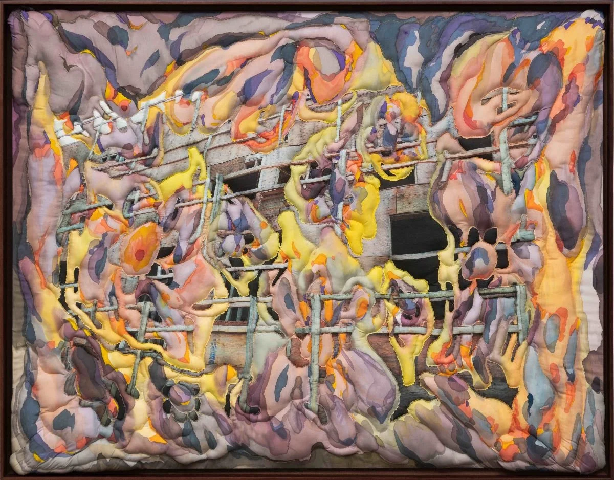 From a distance, Vancouver textile artist Maya Beaudry’s Lattice looks like a colourful quilt of swirling organic forms. Look closer and you start to see flames licking up. Move closer yet, and you see them engulfing a photo image of a wood building—a sly nod to the cycle of deconstruction and construction in her real-estate-enflamed hometown.