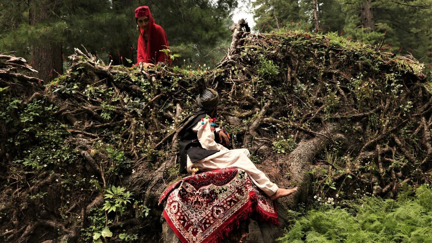 The beauty of the place often has the heightened feel of a fairy tale: a pink-veiled Laila sitting amid an emerald, mossy pine forest, or restlessly lying in a red-quilted bed under a scrolling, leafy mural on a clay-hut wall.