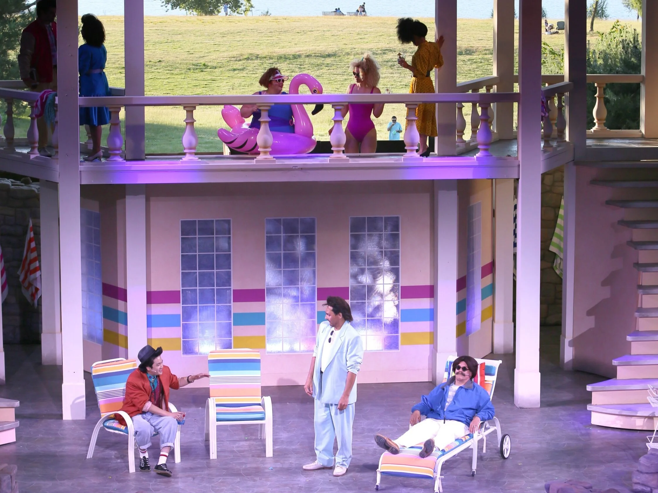 Carmen Alatorre’s gleefully maximalist costumes are an impressive feat. Pam Johnson’s retro-fantasy set channels McMansion opulence—arches, pastel palettes, ornamental shrubs—and opens into the mansion of the Duke (a really funny Sheldon Elter) that’s less Renaissance court, more Miami Vice pool deck, ready for youthful drama and reckless abandon.