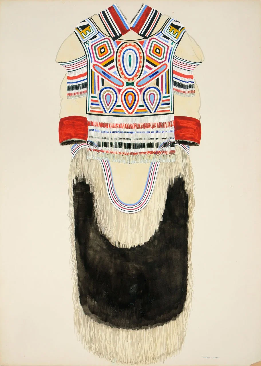 Winifred Petchey Marsh’s Padlirmiut Woman’s Atigi or Inner Coat (Front View), 1933–34, watercolour on paper, Prince of Wales Northern Heritage Centre, Yellowknife, Northwest Territories, Gift of the National Chapter of the Imperial Order Daughters of the Empire, 1977, © Estate of Winifred Petchey Marsh
