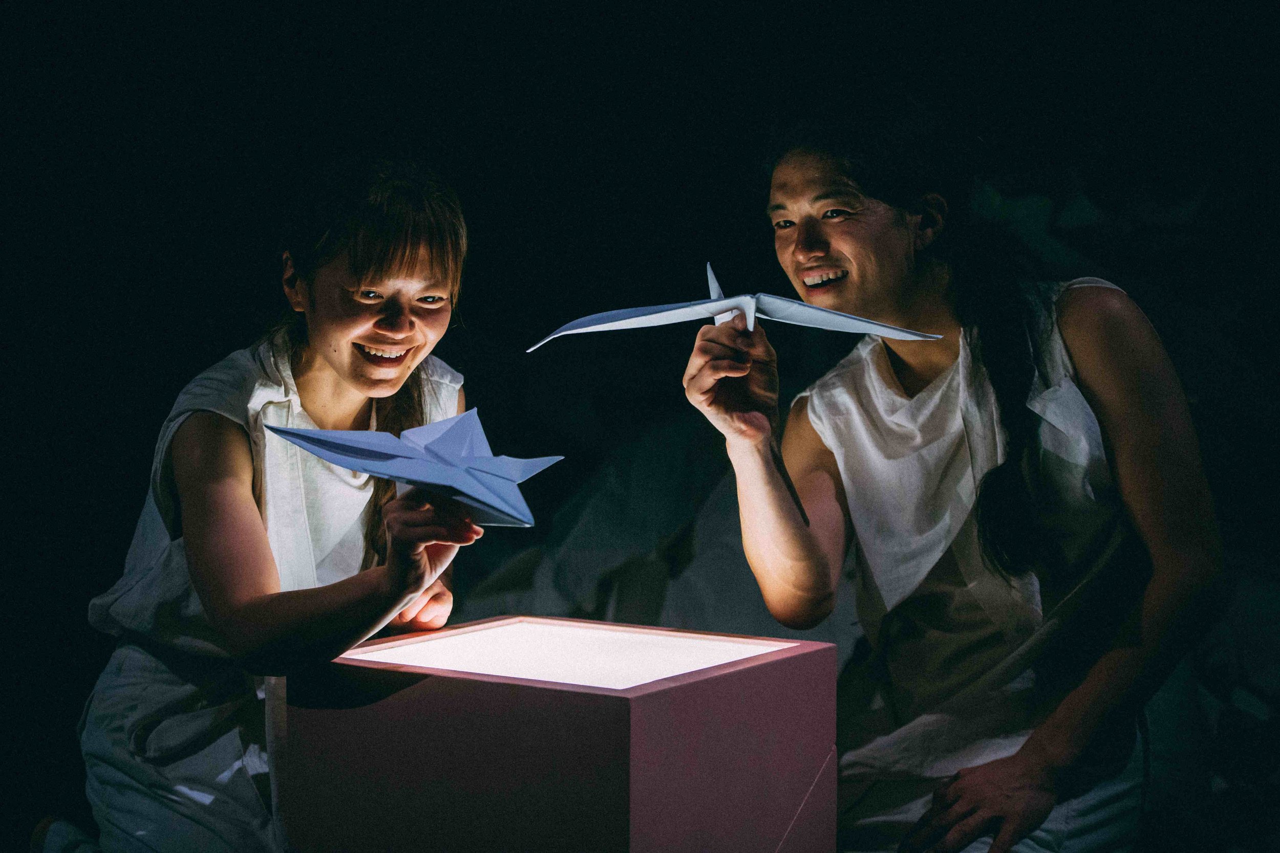The principles of dance-movement psychotherapy have been incorporated into Club Origami along with other accessibility accommodations. At the beginning of the piece, for instance, children are handed a square piece of white A4 printer paper, which they can fold or scrunch as they please while any folks who might be running a bit behind filter into the theatre. Then all the kids’ creations are collected by Matsumoto and Aoyama, who display them onstage throughout the show. At one point, the artists respond to each of the origami pieces with abstract, improvised contemporary movement; if a shape is reminiscent of a bird, for example, they’ll become birds onstage.