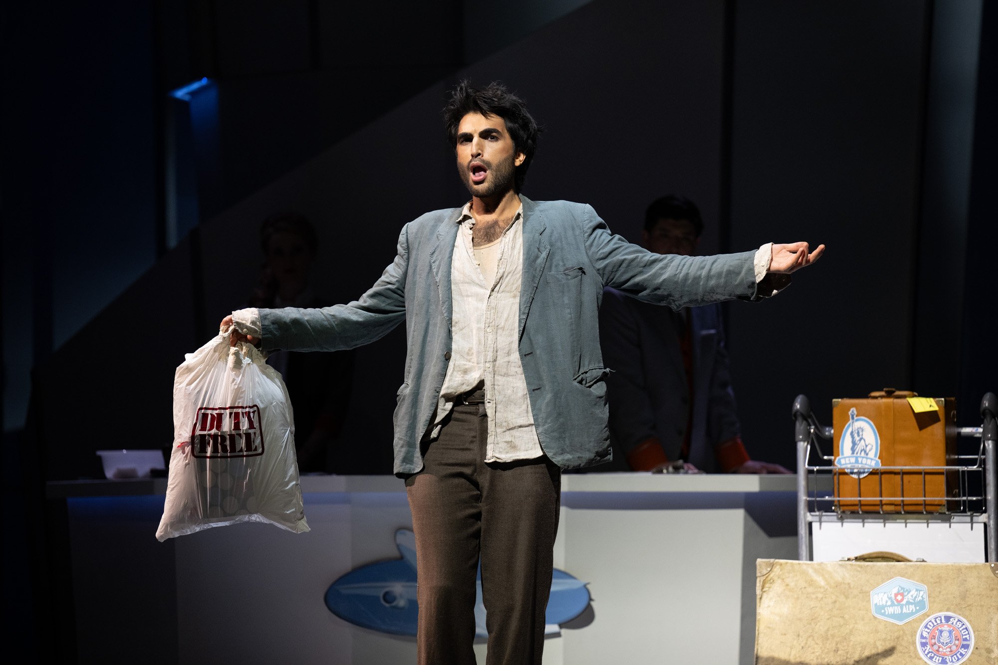 The first two acts build to an increasingly absurd limbo—and like an extended flight delay, little happens action-wise. Before intermission, it feels like The Refugee’s story is getting shortchanged next to that of his globetrotting fellow passengers. Full disclosure: a few opera traditionalists left at intermission. That turned out to be their loss. Flight gets full liftoff in the third act, tapping all its power, both comedic as the visual gags reach their absurd heights, and heartwrenching as The Refugee’s back story is finally revealed. In the end, the Vancouver Opera audience gave it a standing O.