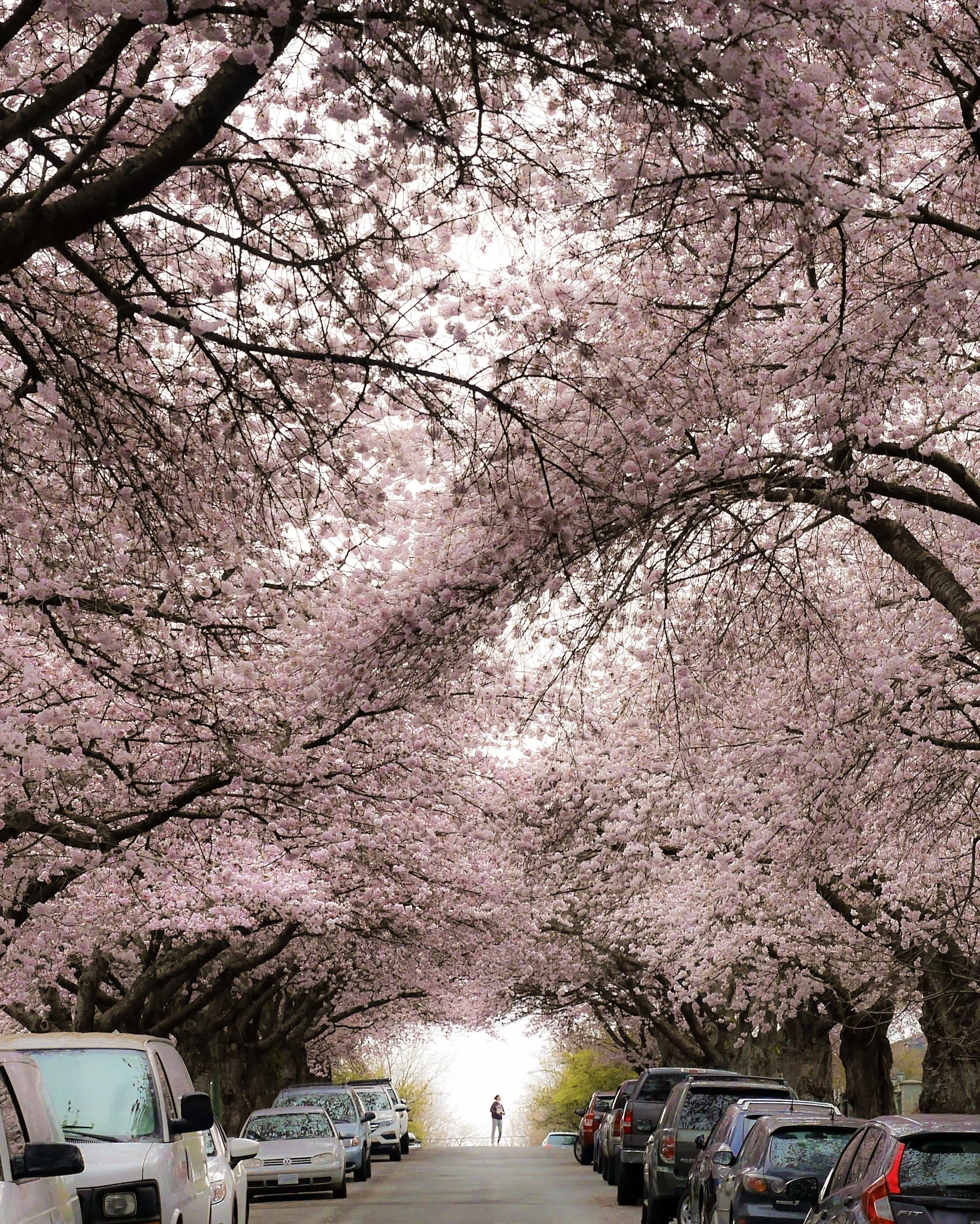 PICTURE YOURSELF STANDING by one of Vancouver’s resplendent cherry blossom trees in full bloom. Now envision being surrounded by so much awe-inspiring pink and listening to a gentle voice saying things like: Notice the shape of the branches. Trace the branches with your vision. Lift your arm up imagine you’re tracing the branch with your fingertips. Notice the colours. Close your eyes and take a deep breath: what are you noticing? What are the sounds around you? Open your eyes and imagine blossoms falling down all around your body. How does that make you feel?