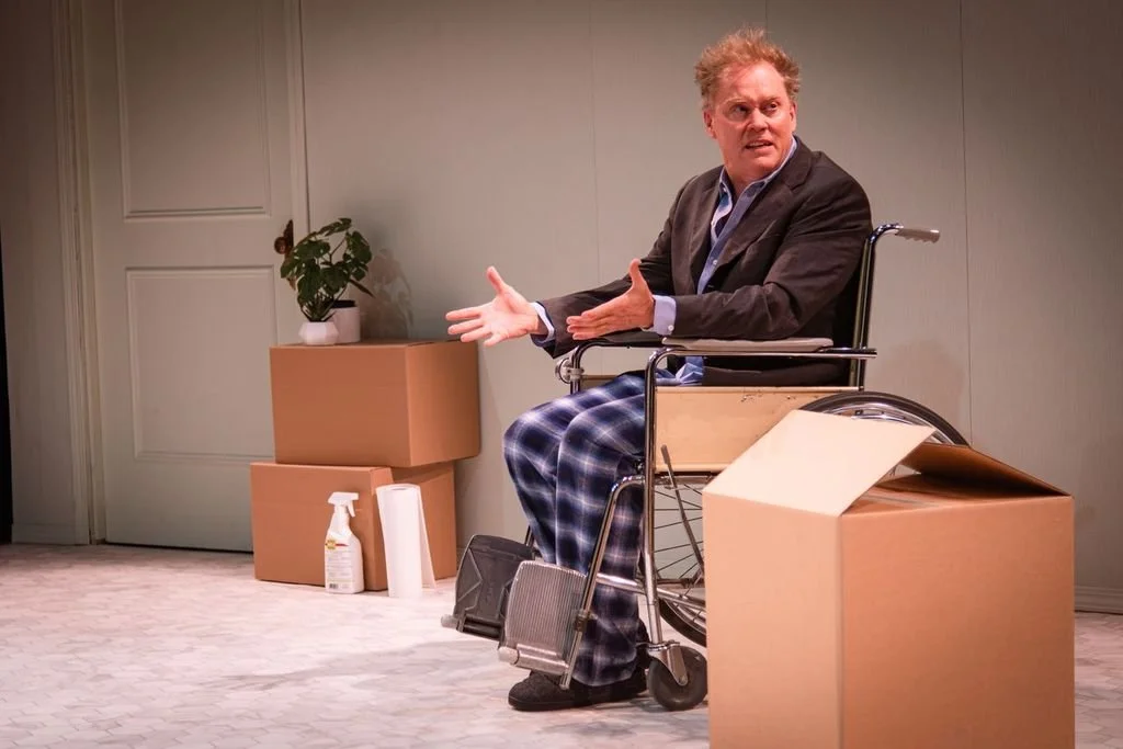 Directed once again by PT artistic director Kaitlin Williams, the show feels right at home in the company’s intimate, familiar space. The setup is minimal: two actors and a few packing boxes. There are no clear details about who the man in pyjama bottoms and a suit jacket is, or why he’s addressing us directly, just a guy (named Guy) rolling across the stage in a wheelchair, circling through his thoughts and talking himself (and us) closer to whatever comes next. What’s next is death, but not much else is as clear.