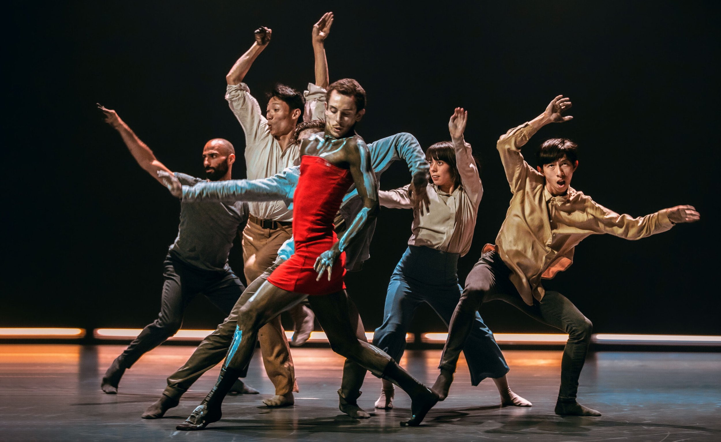 The choreographer likes to ground his works in that raw authenticity, but then upends, deconstructs, or alters it in surreal, and cleverly meta, ways. In the case of Story, story, die., the fragmented lines of speech become staggered, a door on the stage literally opening and slamming on each narrative bit. Some of his touches verge on the dreamlike: an unsettling teddy bear and a figure in skeleton paint and a red-bustier dress. (Though their movement languages are markedly different, critics have compared his use of and physicalization of spoken text to Crystal Pite.)