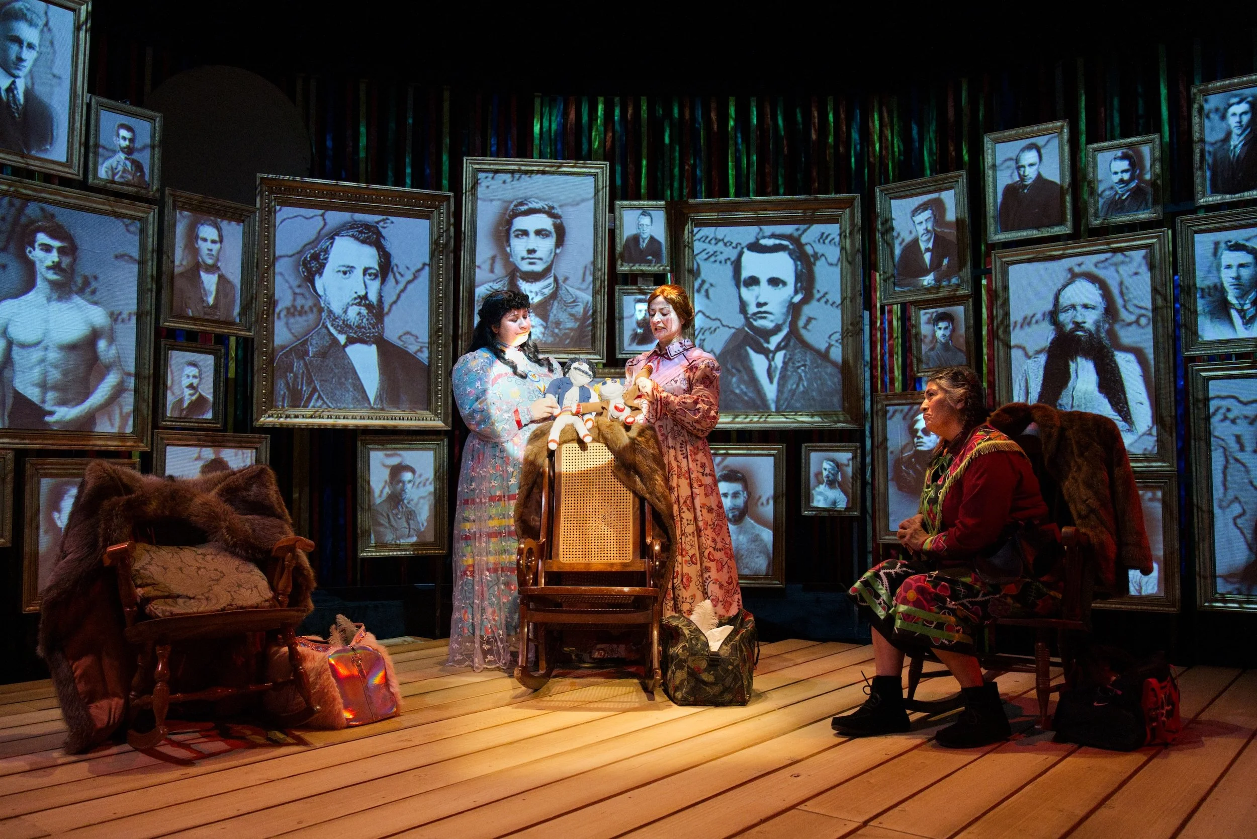 Lauchlin Johnston’s set has a few smart surprises and leans into the show’s underlying metatheatricality (the women wonder where Eugenia actually goes when she heads out hunting, or what it feels like to walk through a door). They sit in front of an engulfing wall of men’s faces; Riel, Scott, Dumont, even (why not?) Andy Warhol. Candelario Andrade’s projections give the portraits a creepy little twitch of life.